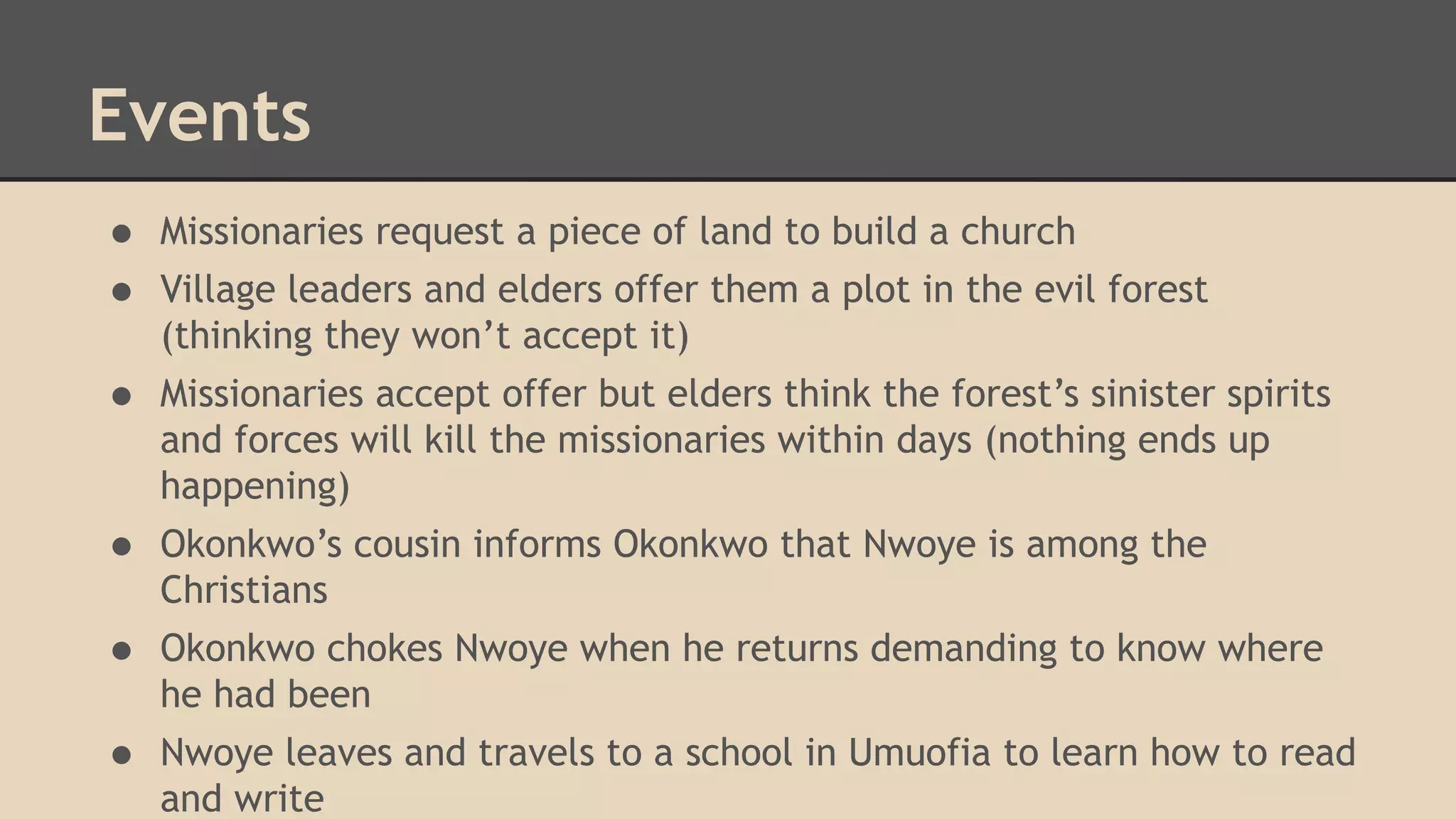 The missionaries request land to build a church. The village elders offer them a plot in an evil forest, expecting the sinister spirits there to kill the missionaries. However, nothing happens to the missionaries. Okonkwo's cousin tells him that Nwoye has joined the Christians. When Nwoye returns, Okonkwo chokes him for information and Nwoye leaves to attend a Christian school in Umuofia.