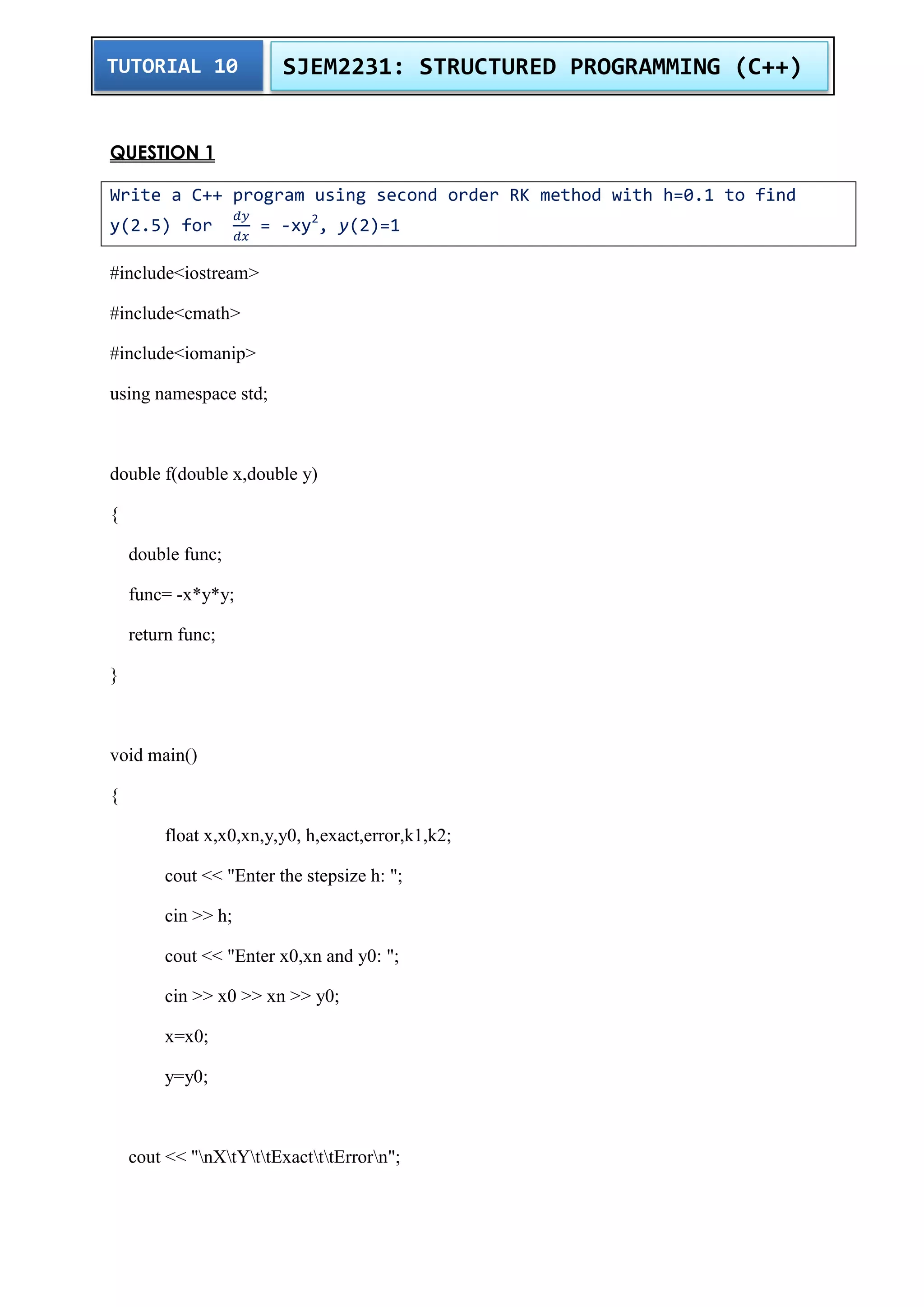 The document contains a series of C++ programming tutorials focused on implementing various numerical methods, including the second order Runge-Kutta (RK2) and fourth order Runge-Kutta (RK4) methods for solving differential equations. Several problems are presented, each requiring the creation of C++ programs to approximate solutions for specified functions with given initial conditions and step sizes. The results from different methods are compared to determine accuracy, with RK4 generally showing smaller error differences than RK2.
