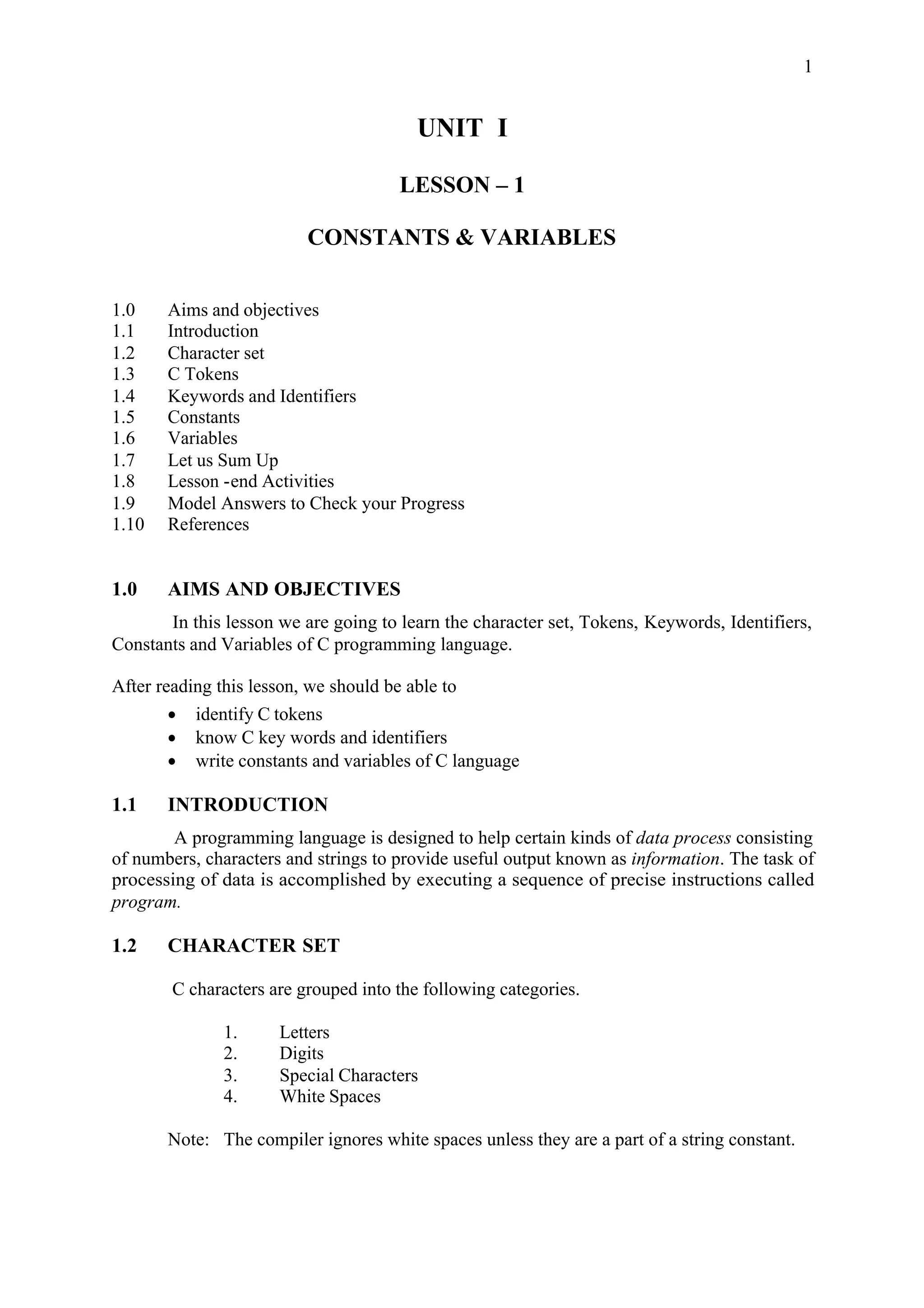 This document provides an introduction to constants and variables in the C programming language. It discusses C's character set including letters, digits, special characters, and white spaces. It also covers C tokens, keywords and identifiers. The document defines different types of constants in C like numeric constants (integer and real), character constants, string constants, and backslash character constants. It describes variables in C including rules for defining variables. It provides examples of declaring and assigning values to variables. The overall summary is that this document serves as an introductory lesson on the basic building blocks of constants and variables used in the C programming language.