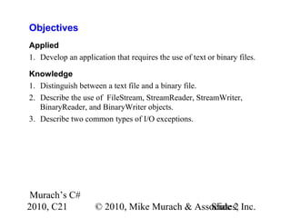 This document discusses working with files and data streams in C#. It covers text files versus binary files, and classes for working with files like FileStream, StreamReader, StreamWriter, BinaryReader, and BinaryWriter. Specific methods of these classes are described for reading and writing data to files. Exceptions that can occur during file I/O are also covered. Code examples demonstrate how to read and write data to both text and binary files, and how to handle potential exceptions. A ProductDB class is presented that encapsulates common file operations for a product database stored in files.