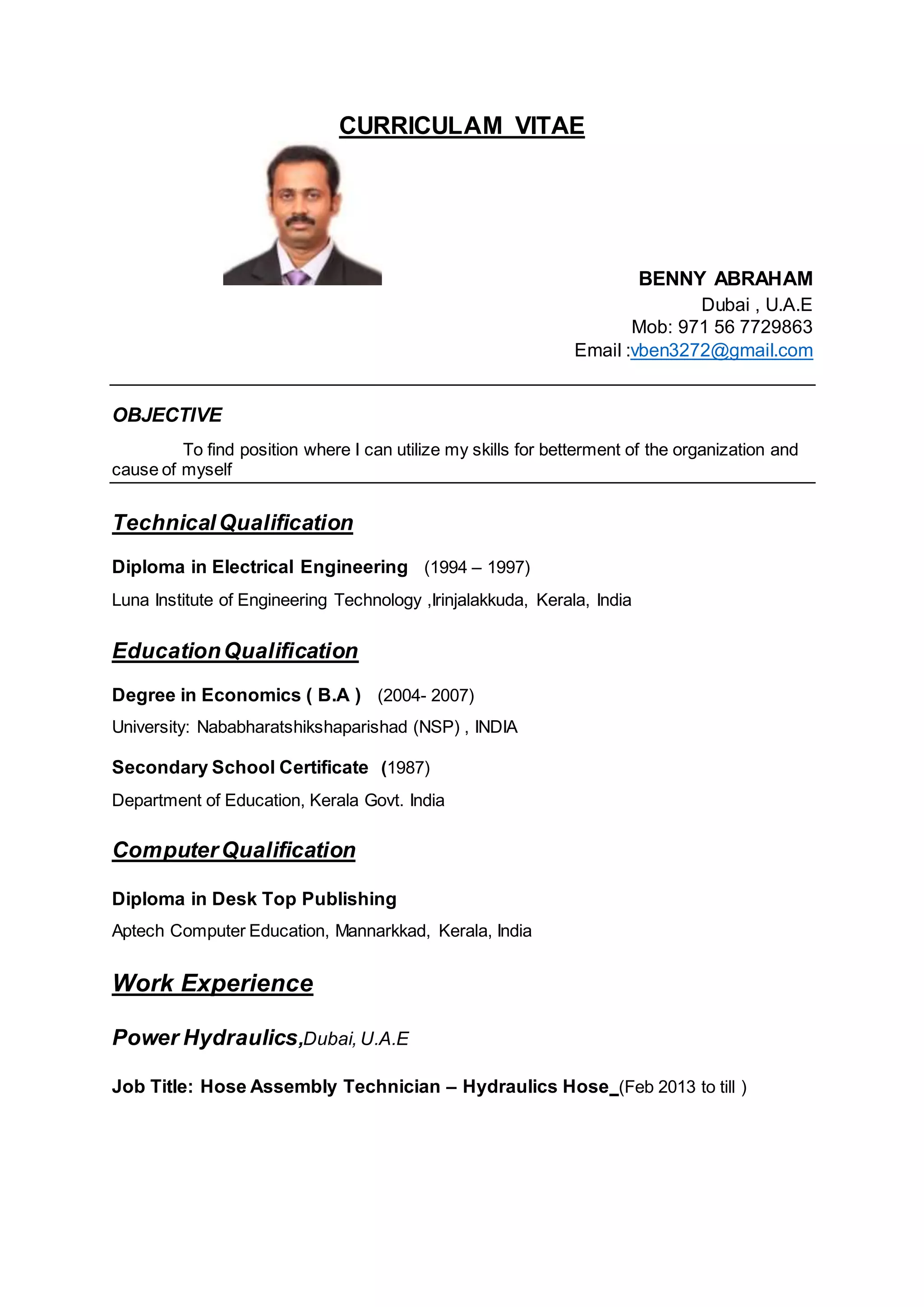 Benny Abraham is an electrical engineer from India seeking a position in Dubai where he can utilize his skills. He has a diploma in electrical engineering and a degree in economics. His work experience includes positions as a hose assembly technician, driver, technician handling electrical and plumbing work, and electrician/plumber. He has skills in customer service, quality control, and teamwork. He is married, speaks several languages, and has a valid UAE driving license.