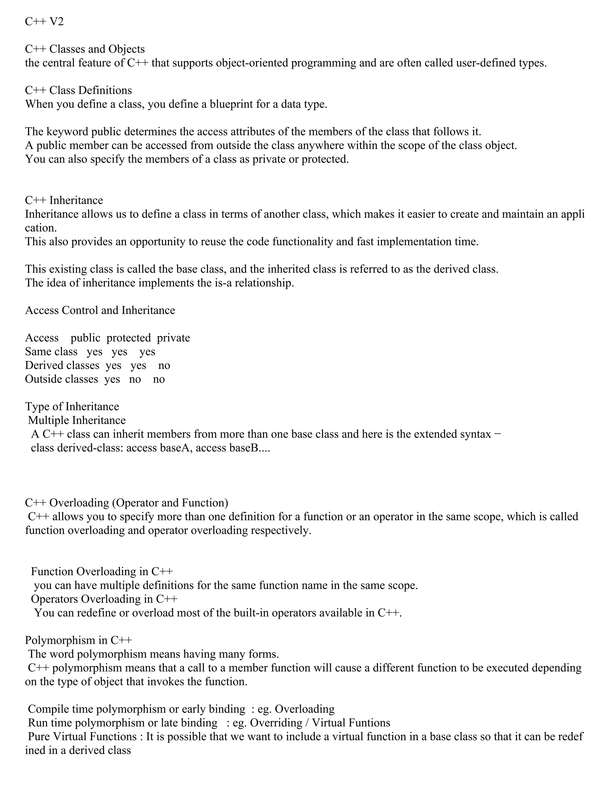 C++ classes and objects are the central feature that supports object-oriented programming in C++. A class defines a blueprint for a data type, and classes can inherit members from base classes, allowing code reuse. Polymorphism means a function call will cause different code to execute depending on the object type. Abstraction and encapsulation bind data and functions together and hide implementation details. C++ supports exception handling, dynamic memory allocation using new/delete, and file input/output streams.