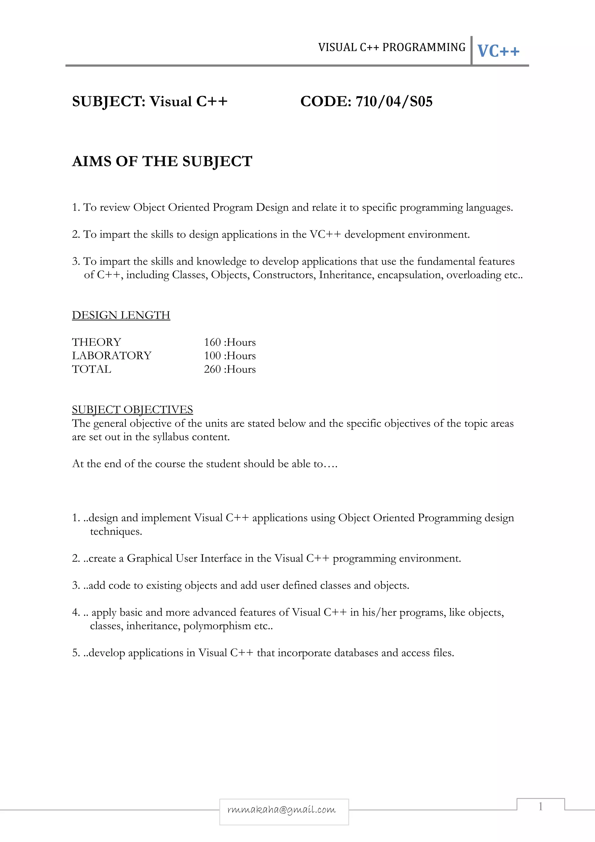 This document outlines the aims, design, objectives, and units of a Visual C++ programming course. The aims are to review object-oriented design and impart skills in developing VC++ applications using fundamental C++ features like classes, objects, inheritance, and encapsulation. The course is divided into units that cover developing applications using the VC++ IDE, object-oriented programming concepts, and Visual C++ basics like data types, expressions, and control structures. Key concepts like classes, objects, inheritance, polymorphism, encapsulation, and abstraction are defined. The document provides details on theory and practical lessons for each unit.