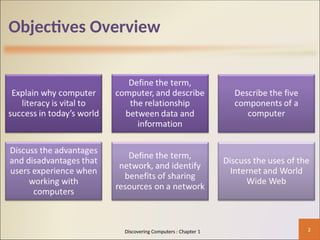 Chapter one of 'Discovering Computers' introduces the basic concepts of computers, highlighting their ubiquitous presence and defining what a computer is as an electronic device managing stored instructions. It covers essential components and functionalities, including hardware, software, networks, and the internet, as well as the various types of computers like personal computers, servers, and supercomputers. Additionally, the chapter discusses advantages and disadvantages of computer usage with a focus on green computing practices.