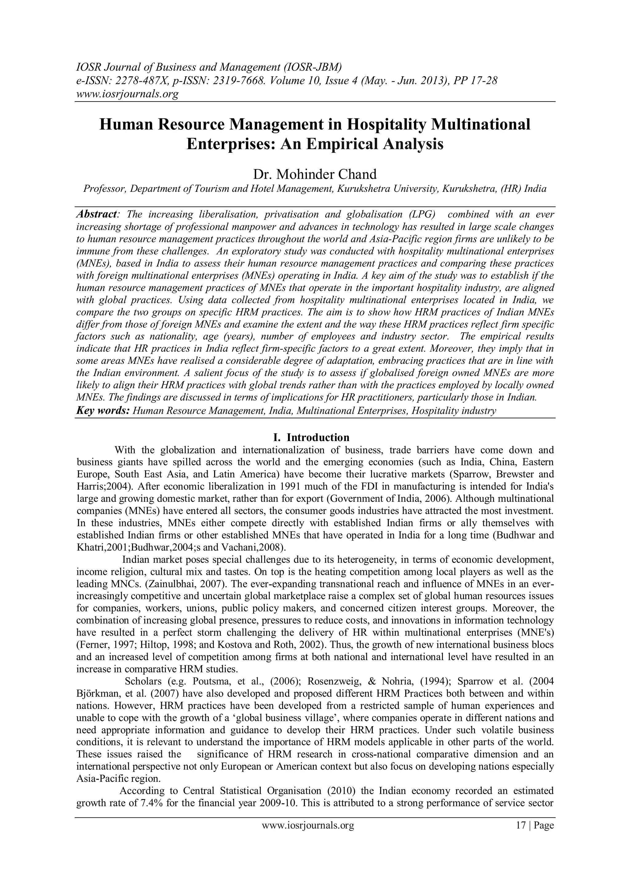 This document discusses human resource management practices in hospitality multinational enterprises operating in India. It begins with an introduction on the growth of multinational enterprises globally and their presence in emerging markets like India. It then reviews literature on factors that influence the human resource management practices adopted by foreign multinational subsidiaries operating in a host country, including pressures for standardization versus localization. The study aims to compare the HRM practices of Indian hospitality MNEs to foreign hospitality MNEs operating in India and examine how practices are influenced by firm-specific factors like nationality, size, and industry. It hypothesizes that HRM practices will remain aligned with the local cultural environment and diverge from practices in foreign MNE subsidiaries.