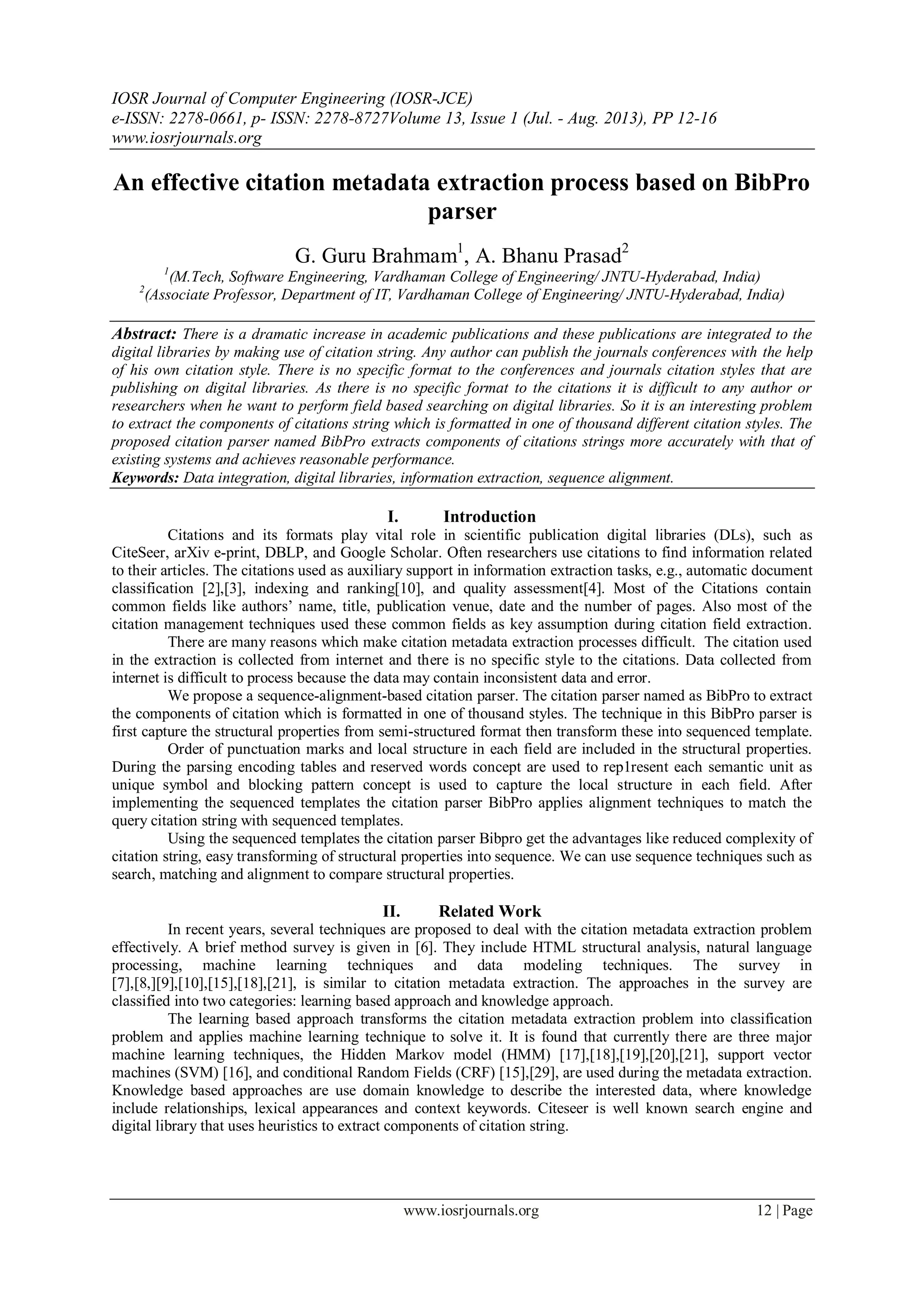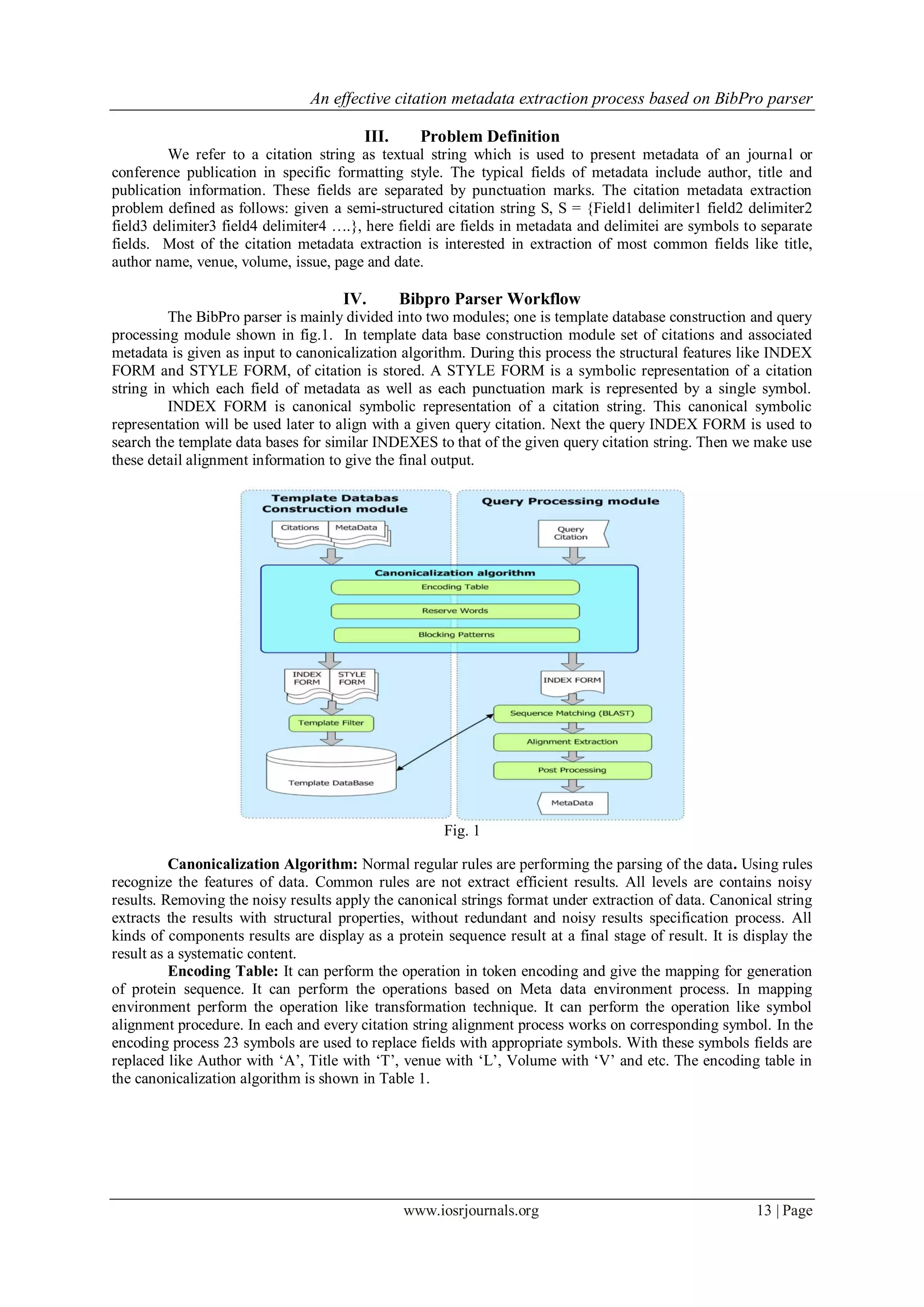 The document describes a citation metadata extraction process called BibPro that uses a sequence alignment approach. BibPro first captures structural properties from citation strings and transforms them into sequenced templates. It then applies encoding tables and reserved words to represent fields as unique symbols. Blocking patterns are used to capture local field structures. BibPro constructs a template database and then aligns query citations to templates to extract metadata fields like author, title, publication details. The approach achieves more accurate extraction than existing systems through its use of citation string sequencing and alignment techniques.