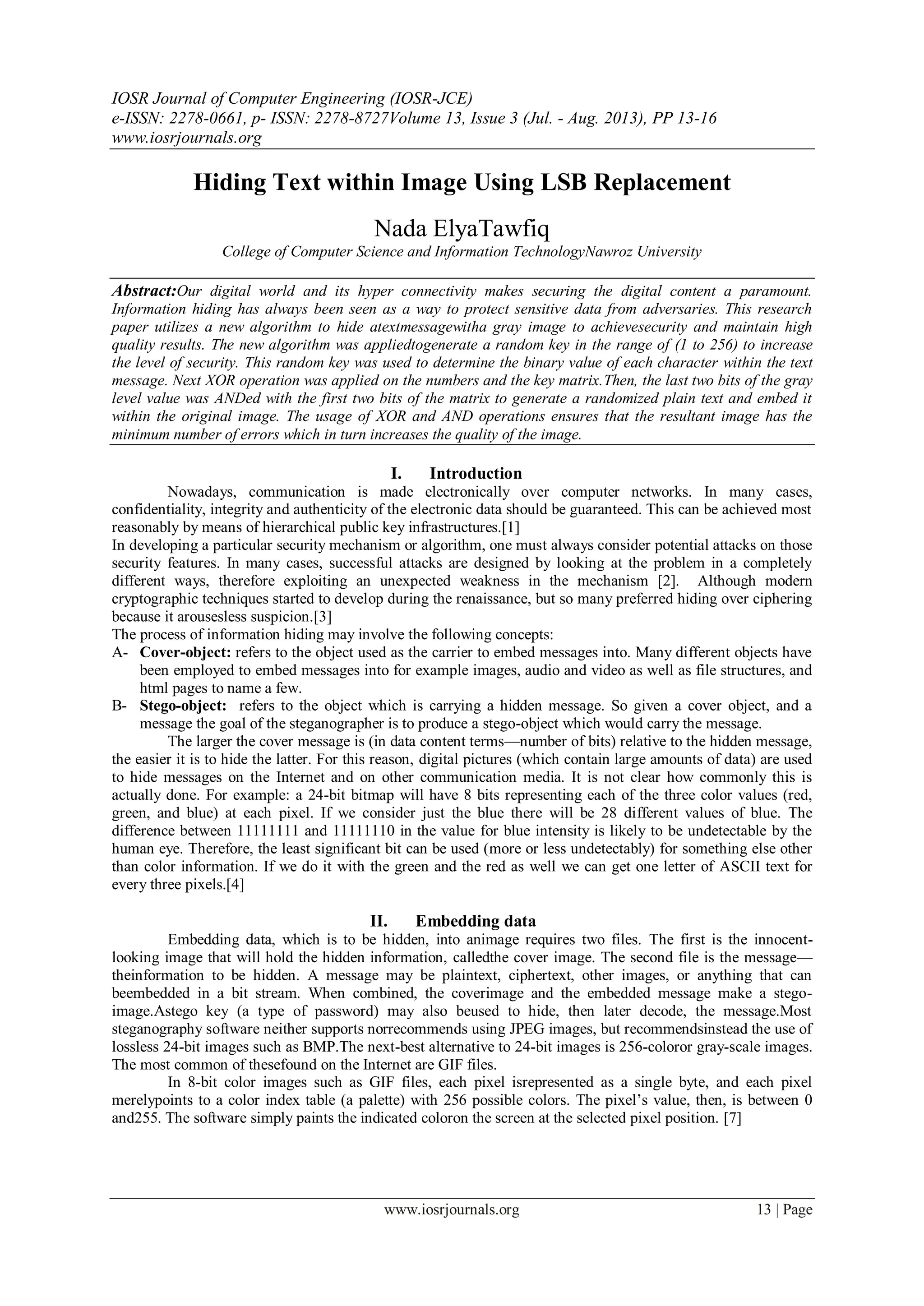 The document proposes a new algorithm for hiding text within a gray image using least significant bit (LSB) replacement with increased security. The algorithm generates a random key between 1-256 to encrypt the text before embedding it in the image. It uses XOR and AND logic operations to modify the LSB of pixel values and embed the encrypted text. Experimental results show the embedded text can be concealed within the image while maintaining high image quality with PSNR values over 75dB. The algorithm aims to improve upon basic LSB techniques by adding an encryption step using a random key to enhance security of the hidden text.