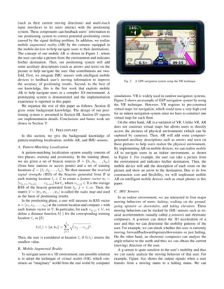 The document proposes a framework that uses intelligent mobile devices to enable indoor wireless location tracking, navigation, and mobile augmented reality (AR). It discusses using mobile devices equipped with inertial measurement units (IMU) and multi-touch screens to provide user feedback to correct positioning errors. The framework also uses mobile AR through device cameras to help navigate users in complex 3D indoor environments and provide interactive location-based services. A prototype system was developed to demonstrate the feasibility of the proposed application framework.
