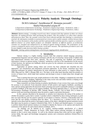 This document summarizes a research paper that proposes an opinion mining methodology using ontologies and natural language processing techniques to perform feature-based sentiment analysis of customer reviews. It begins by collecting customer reviews from websites. The reviews are preprocessed by removing URLs, usernames, etc. and part-of-speech tagging is used to extract product features. An ontology is constructed to organize the features and their relationships. Term frequencies are calculated to determine feature importance. Sentiment analysis is performed using SentiWordNet to assign semantic scores and polarities (positive, negative, neutral) to each feature. N-gram analysis is also used to identify opinion words related to features. The methodology is evaluated using precision, recall and F-measure. The results