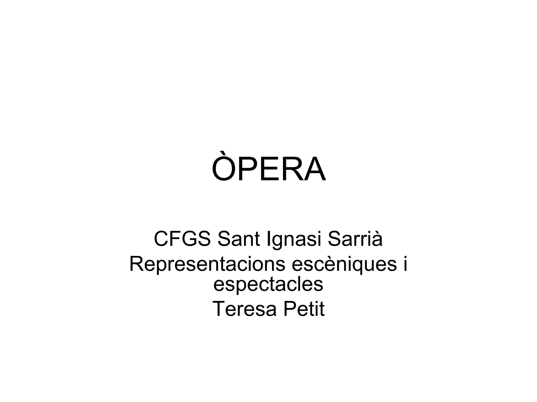 D’on prové l’òpera1500Florentine Camerata: re-crear tragèdies gregues a l’antiga usança: amb un cor de cantants.Itàlia és qui marca, un cop més, la pauta estilística: ús de la música i el cant en l’espectacleDesig d’ostentació i luxe com a demostració de poder dels seus mecenes: públic distingit des dels inicisLa primera òpera va ser estrenada el 6 d’octubre de 1600, per a commemorar la boda de Maria de Medici amb Enric IV. El seu títol: Eurídice (títol molt recorregut posteriorment en òpera) i el seu autor: Jacobo Peri.