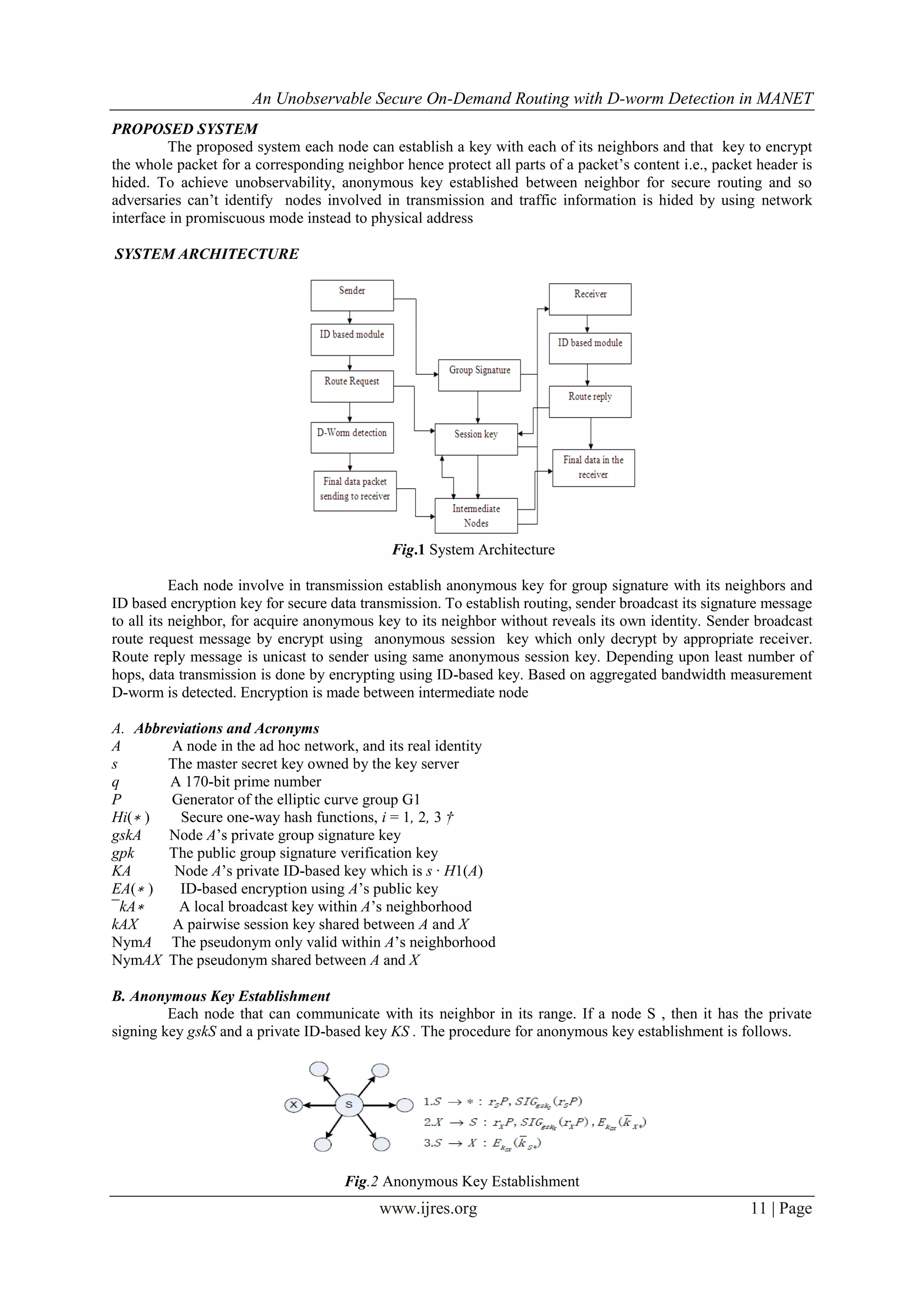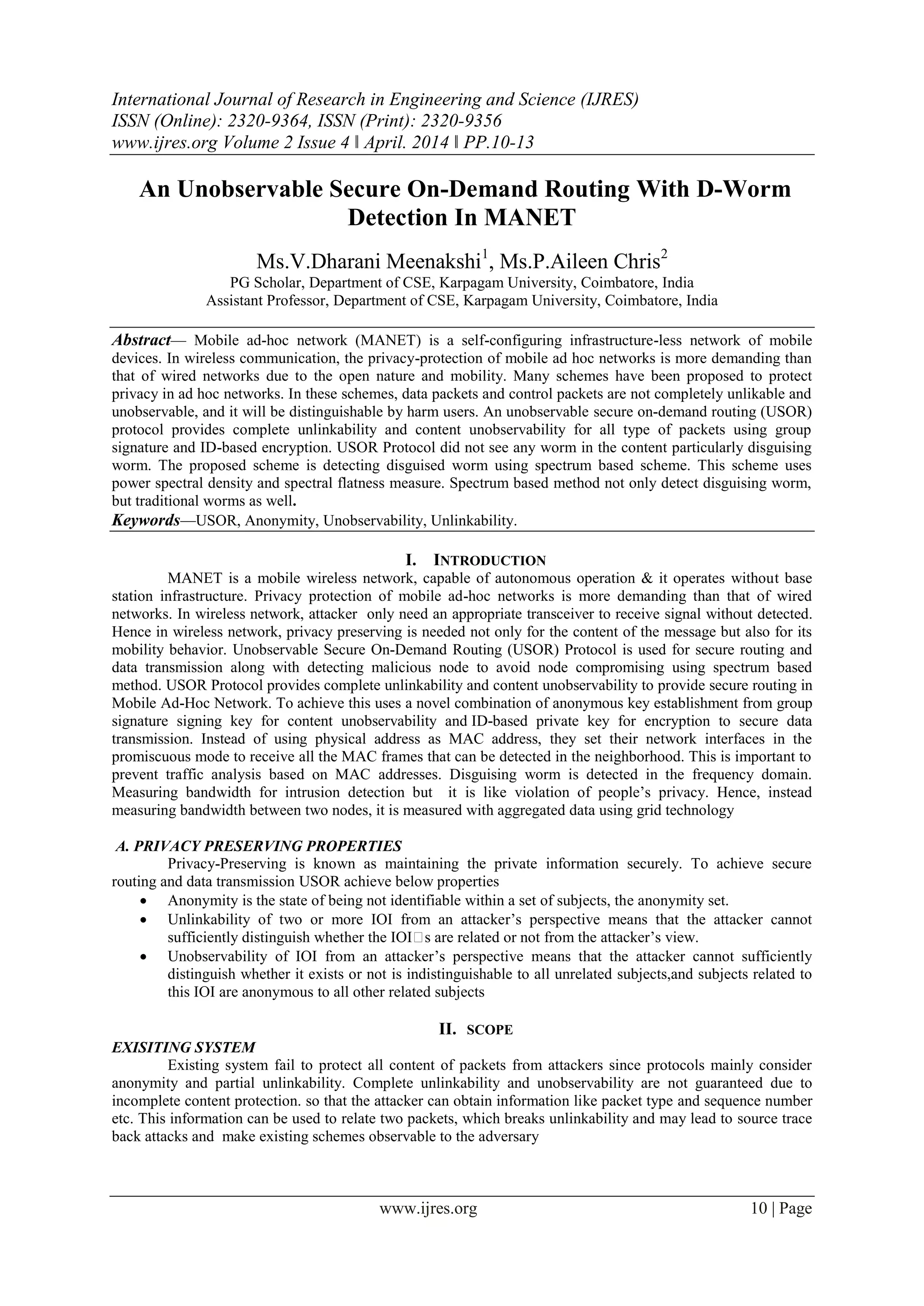 The document presents an unobservable secure on-demand routing (USOR) protocol for mobile ad-hoc networks (MANET) that ensures privacy by providing complete unlinkability and content unobservability for all packet types using a combination of group signature and ID-based encryption. Additionally, it introduces a method for detecting disguised worms (d-worm) utilizing a spectrum-based approach, focusing on power spectral density and spectral flatness measures. The proposed system significantly enhances the protection of routing and data transmission, addressing vulnerabilities overlooked by existing protocols.