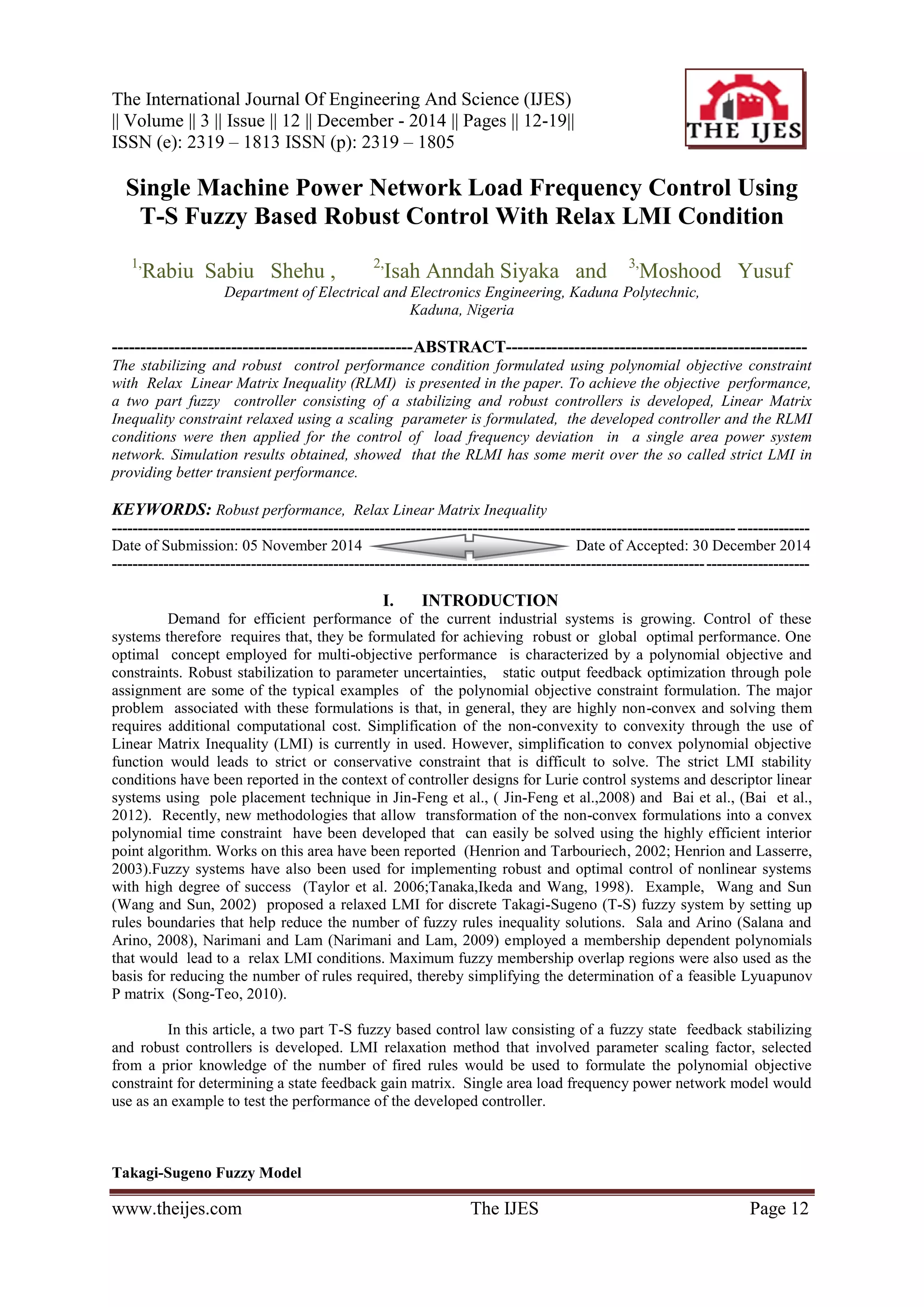 The paper discusses a robust control design for load frequency control in a single machine power network using Takagi-Sugeno (T-S) fuzzy systems with relaxed linear matrix inequalities (RLMI). It highlights the benefits of RLMI over strict LMI in achieving improved transient performance. Simulation results validate the proposed controller's effectiveness, demonstrating robust performance under various system conditions.