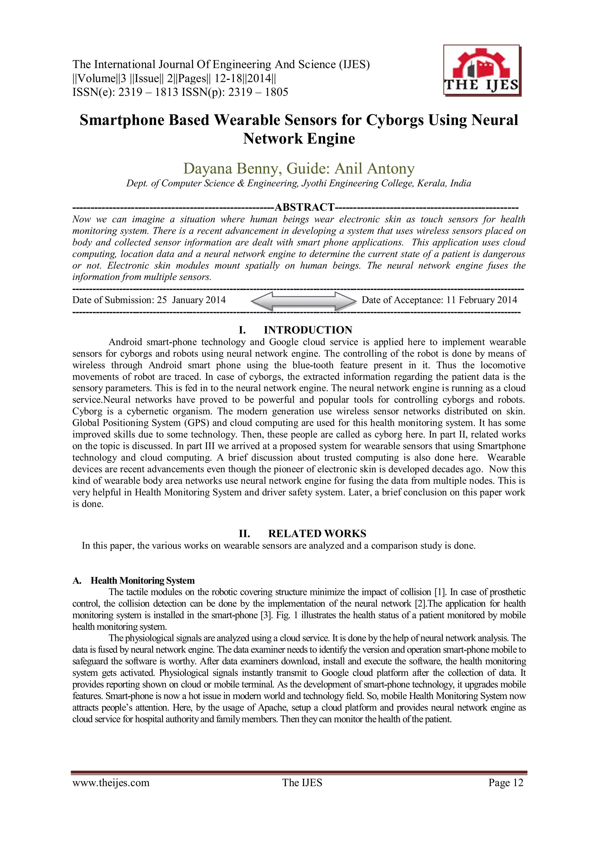 The document discusses the development of smartphone-based wearable sensors for health monitoring, utilizing a neural network engine and cloud computing to analyze physiological data in real-time. It covers related works, system architecture, and applications, emphasizing the potential of wearable electronic skin to enhance health monitoring and safety systems. The proposed system aims to minimize healthcare costs while providing efficient monitoring through mobile technology.