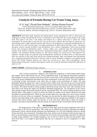 This document presents an analysis of the chassis design for a Formula racing car, focusing on its ability to withstand various racing conditions and ensure driver safety. Various analytical and experimental tests, including front, side, and rear impact tests, were performed using ANSYS software to evaluate stress distribution and deformation, ultimately resulting in a stronger and lighter chassis with a high factor of safety. The design process involved using CAD software and selecting appropriate materials, revealing significant improvements over the previous chassis design.