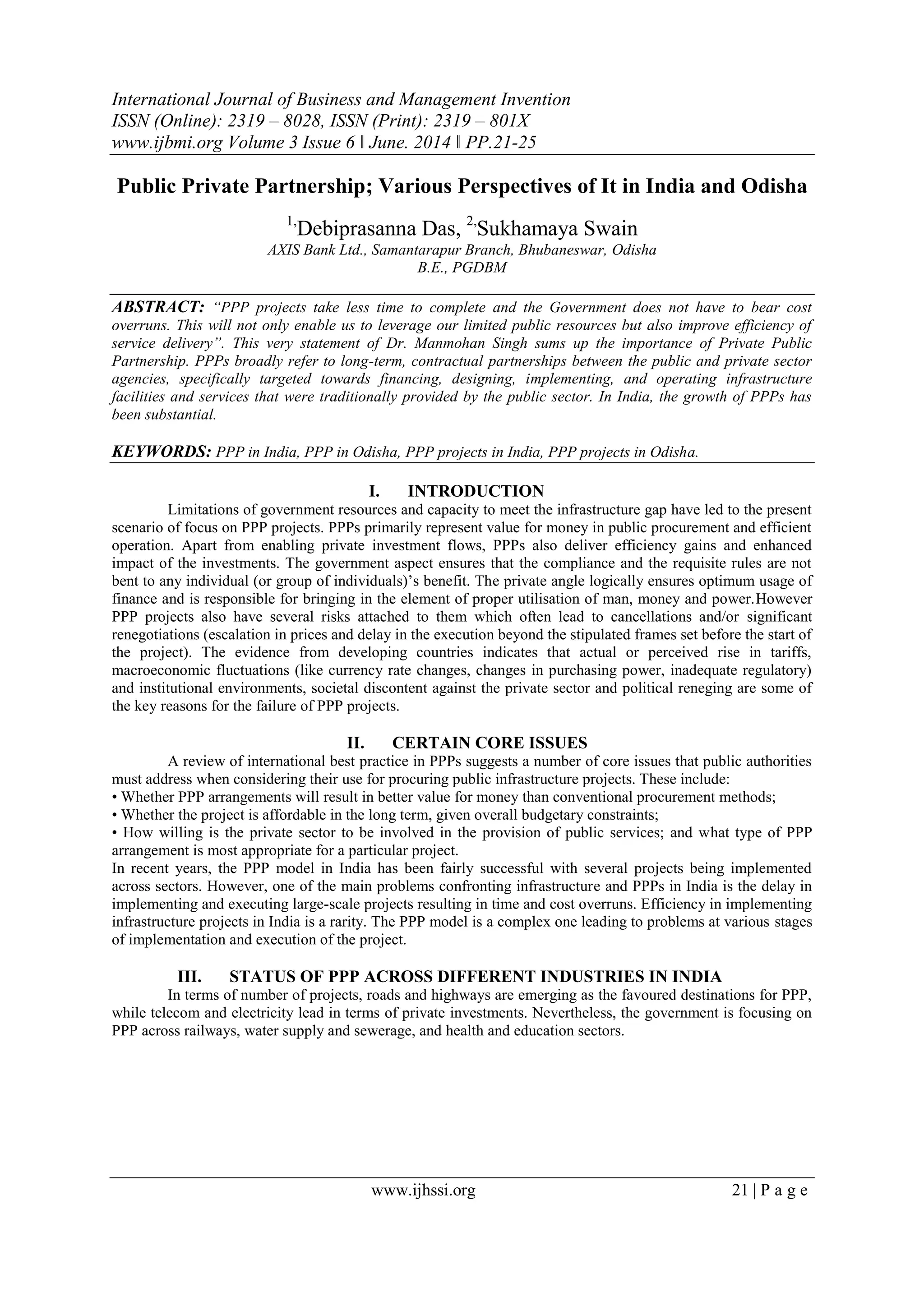 The document discusses the expansion and implications of Public-Private Partnerships (PPPs) in India, highlighting their role in infrastructure development, risk factors, and implementation challenges. It details various sectors such as roads, power, and railways where PPPs have been successful and outlines specific initiatives taken by the Odisha government to promote such partnerships. Despite their potential, the document emphasizes significant hurdles, including policy gaps, financing issues, and land acquisition challenges, which must be addressed to enhance the effectiveness of PPPs.