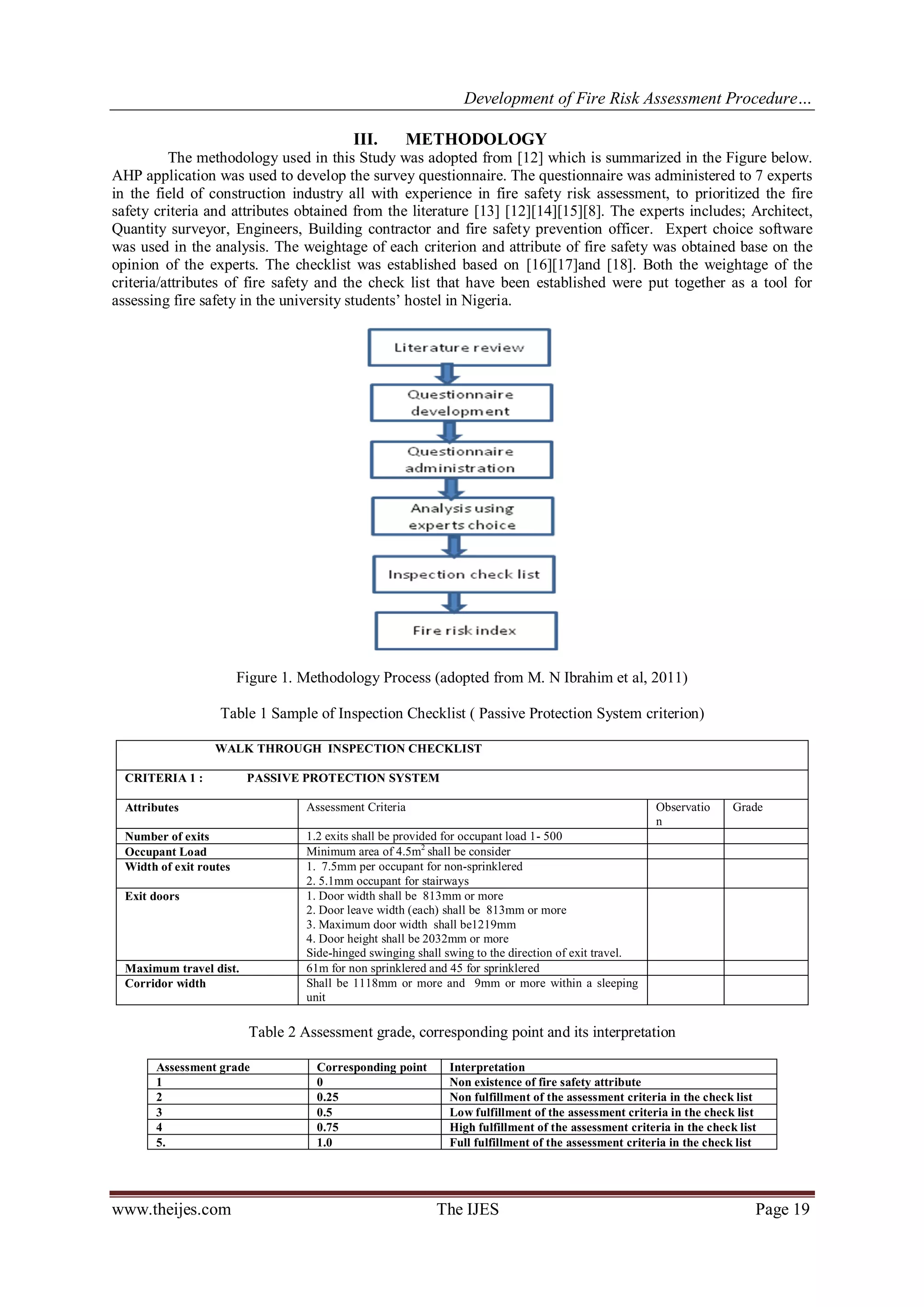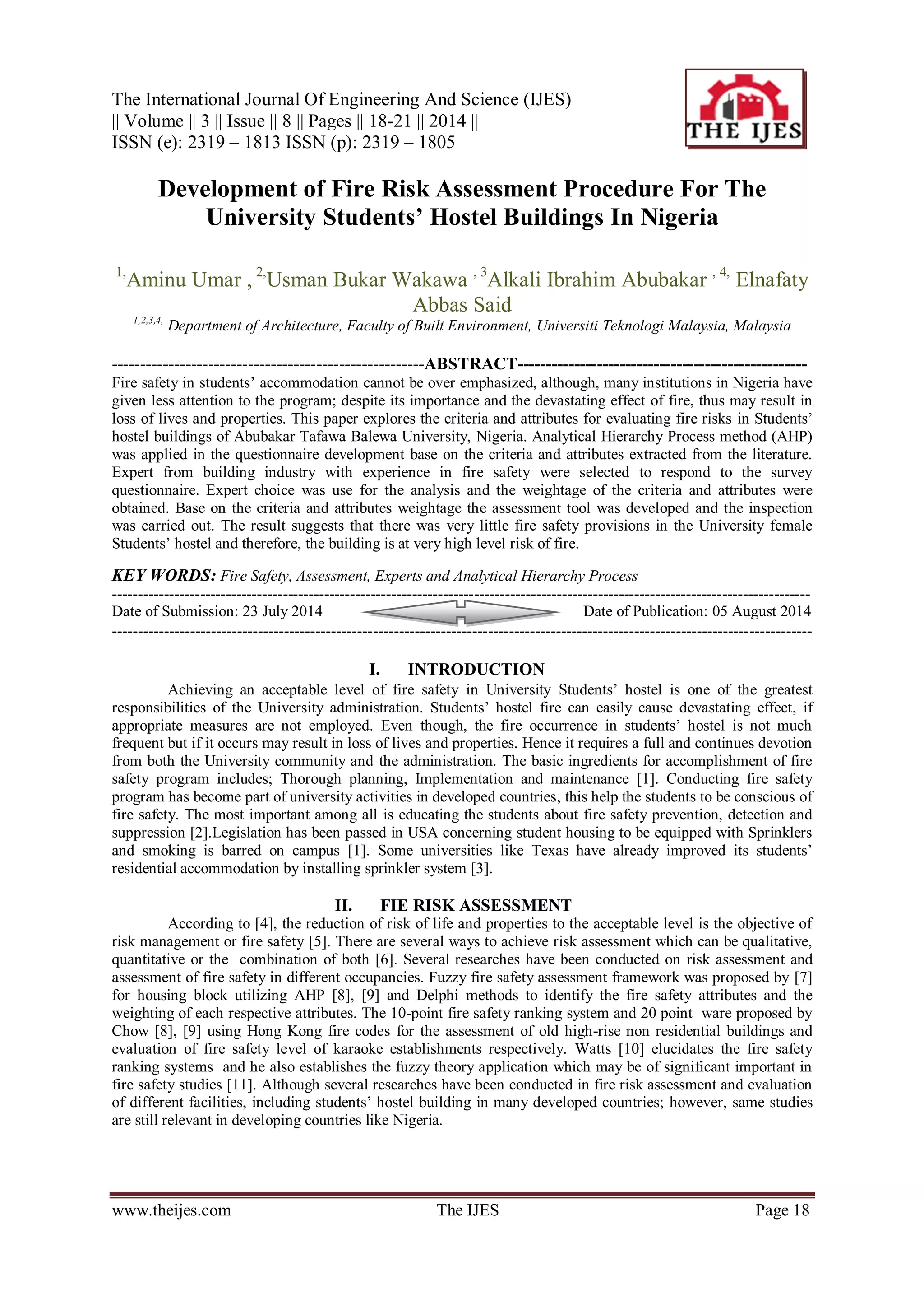The document discusses a fire risk assessment procedure developed for university students' hostel buildings in Nigeria, highlighting the critical need for fire safety measures in these accommodations. Through a survey using the Analytical Hierarchy Process (AHP), experts in fire safety assessed the existing conditions, revealing significant inadequacies in fire safety provisions, particularly in female hostels. The study underscores the importance of raising awareness among management about fire safety regulations to mitigate risks.