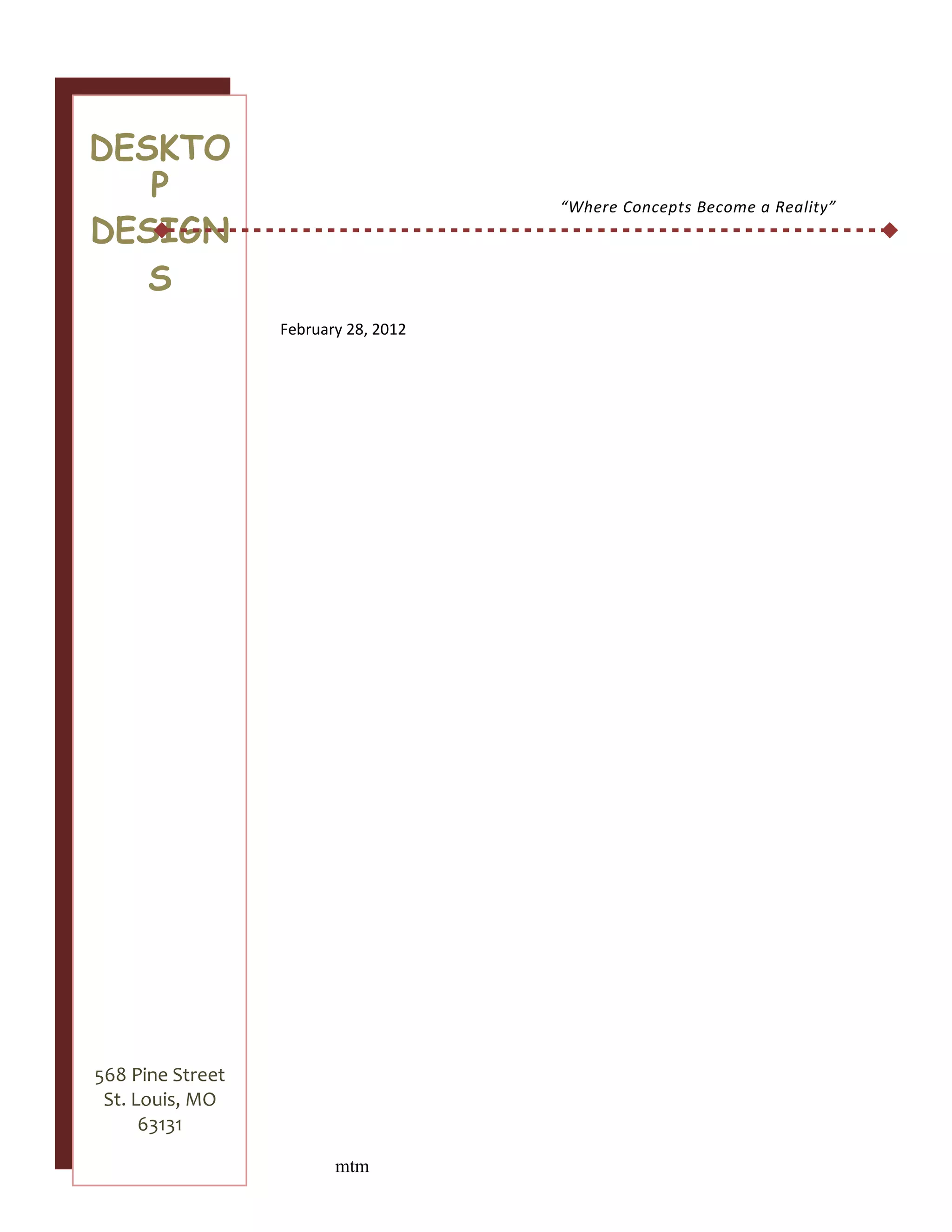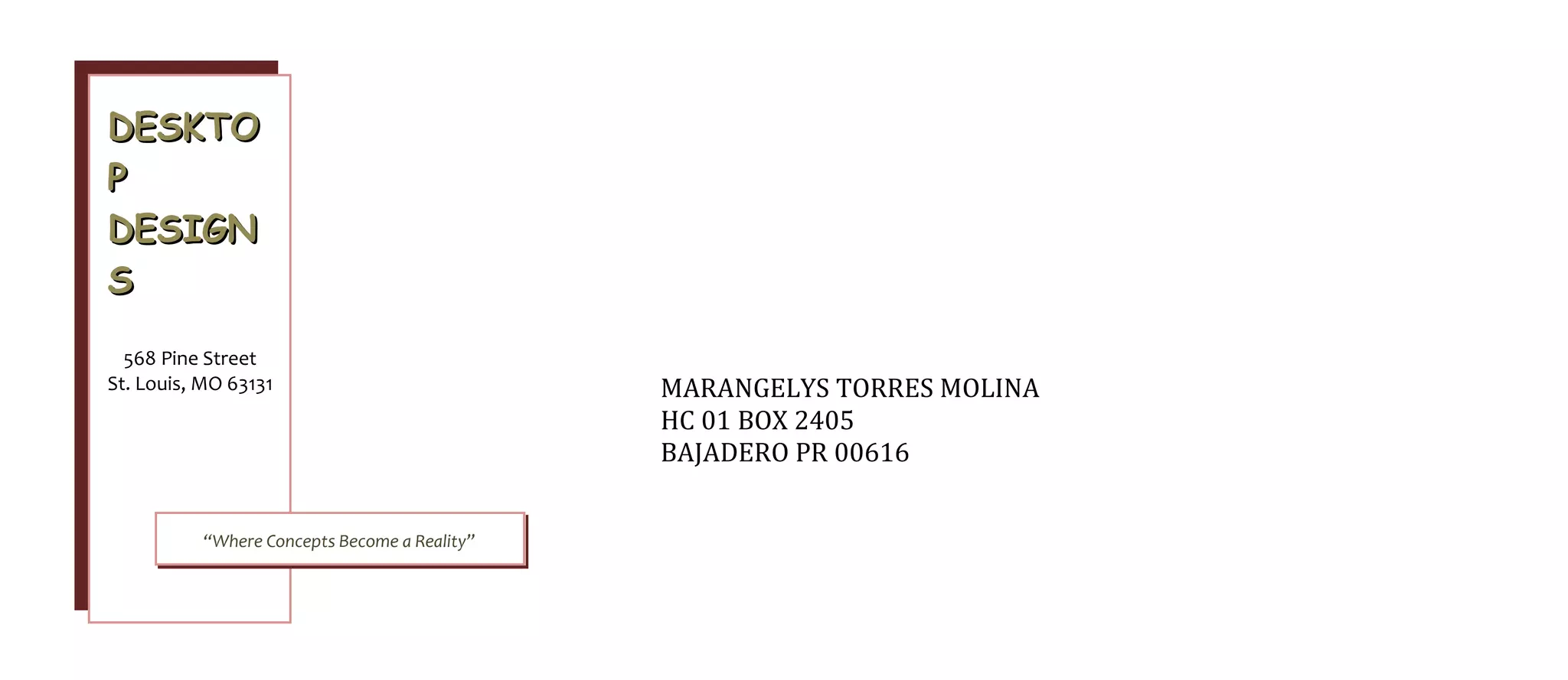 This letter is from Desktop Designs, located at 568 Pine Street in St. Louis, Missouri, to Marangelys Torres Molina in Bajadero, Puerto Rico. Desktop Designs' motto is "Where Concepts Become a Reality".