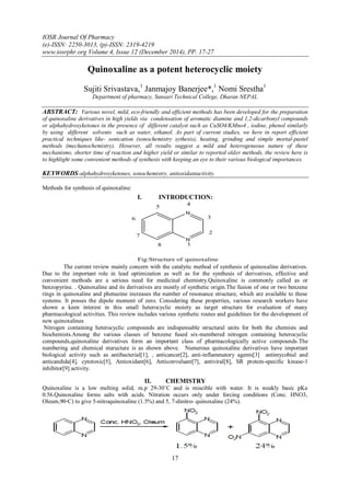 This document reviews novel, eco-friendly methods for synthesizing quinoxaline derivatives, emphasizing various catalytic techniques that offer high yields and shorter reaction times. It discusses the pharmacological significance of quinoxaline compounds, highlighting their biological activities including antibacterial and anticancer properties. The review aims to facilitate further research on quinoxaline synthesis and its applications in medicinal chemistry.