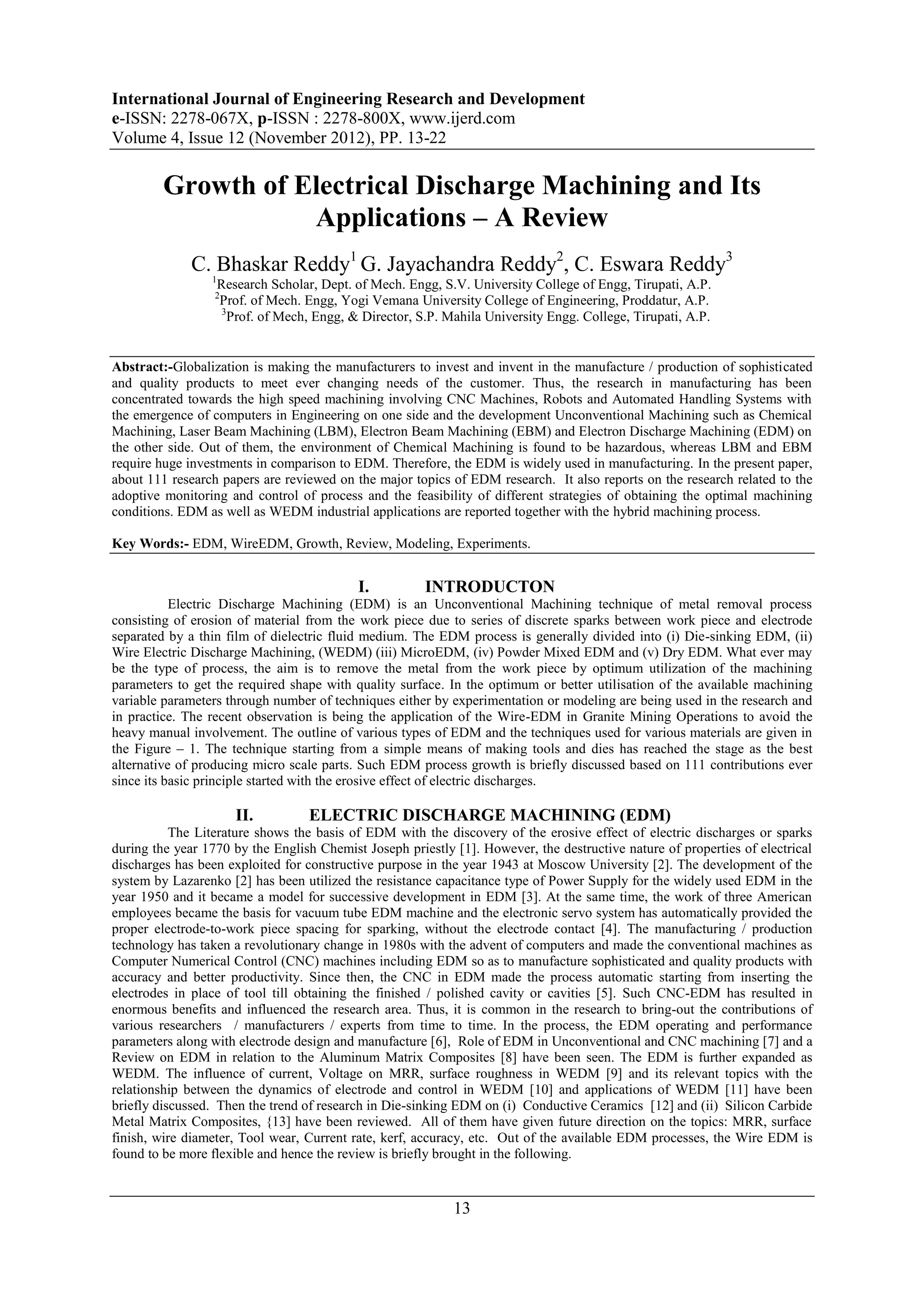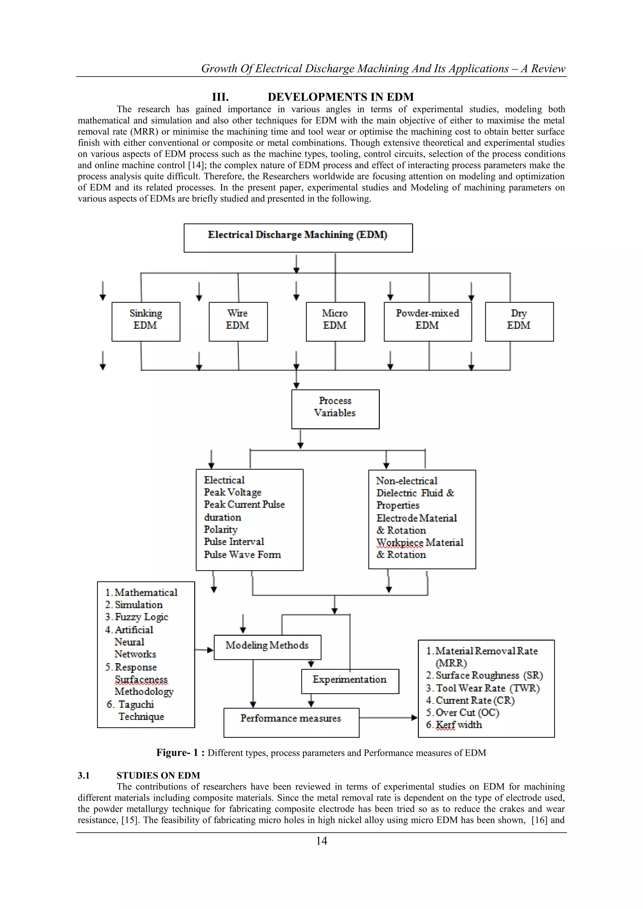 This document provides a review of research on Electrical Discharge Machining (EDM) and its applications. It summarizes 111 research papers on EDM. The summary discusses developments in EDM, including experimental studies on machining different materials and modeling approaches like mathematical models, simulation, fuzzy logic, and artificial neural networks to optimize EDM performance. It also reviews research on Wire EDM processes and applications of modeling techniques like response surface methodology and Taguchi methods. The document concludes that research areas like dry EDM and using water as a dielectric fluid show emerging potential to further enhance EDM capabilities.