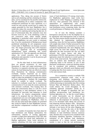 This document discusses optimization of MapReduce for Hadoop-based big data applications. It notes that while Hadoop is effective for large data volumes, its performance could be improved through MapReduce optimization. Specifically, it proposes a multilayered scheduling approach where an initial MapReduce with sample data generates outputs to optimize a final MapReduce processing. This could reduce execution time for exploring large datasets. The document also suggests optimization through techniques like predictive load scheduling, pre-fetching, pre-shuffling, and uniform load distribution across nodes. Overall improvements to MapReduce scheduling are argued to enhance resource utilization and quality of service for big data applications on Hadoop frameworks.