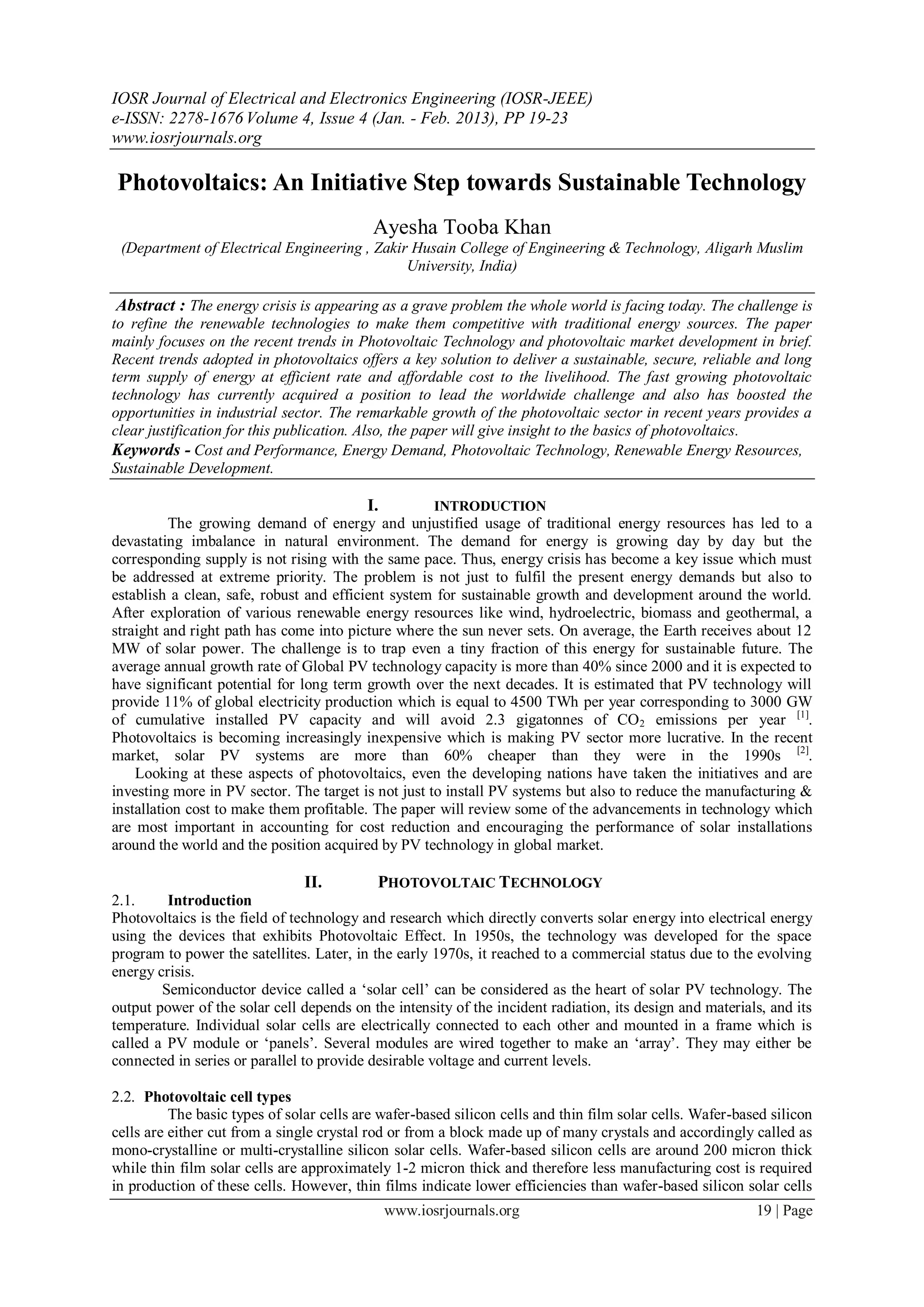 This document summarizes recent trends in photovoltaic technology that are helping to reduce costs and improve performance of solar installations. It discusses nanostructure solar cells being developed at Princeton University that use a plasmonic cavity structure to trap light and achieve up to 175% higher efficiency than conventional solar cells. The document also briefly mentions an all-carbon solar cell developed at Stanford University as an alternative to expensive materials traditionally used in photovoltaics.