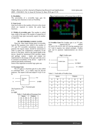 This document summarizes research on basic reversible logic gates and their implementation in Quantum-dot Cellular Automata (QCA). It begins with an introduction to reversible logic and its advantages in reducing power dissipation compared to traditional irreversible logic. It then defines key concepts in reversible logic like garbage outputs and quantum cost. The document describes several important reversible logic gates - the Feynman gate, Fredkin gate, DKG gate, and MRG gate - and provides their truth tables and quantum implementations in QCA. It presents simulation results for these gates in QCA and compares their complexity, area, delay, and simulation time. The document concludes that reversible logic gates can help in designing circuits for quantum computing and other low power applications
