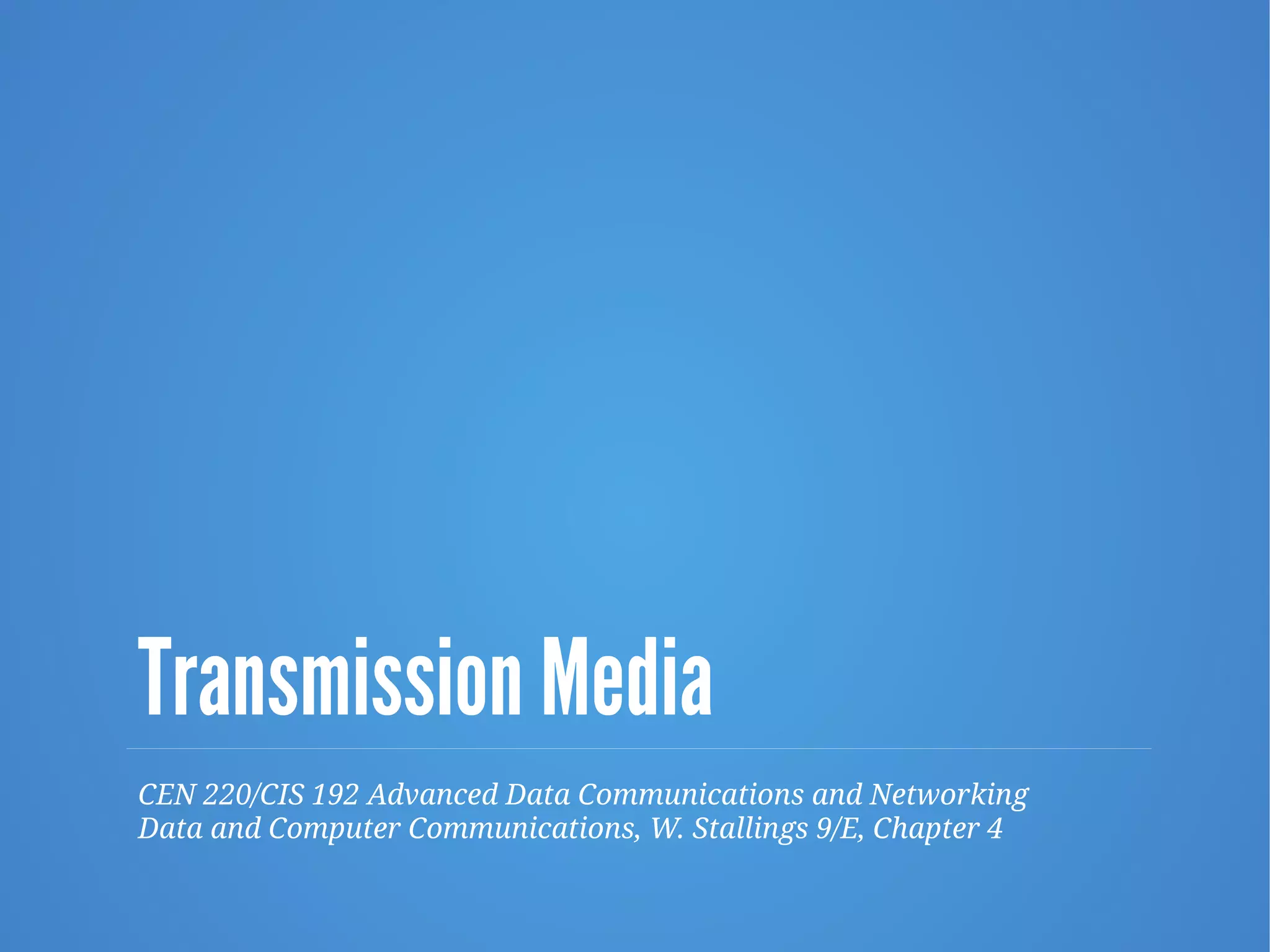 This document discusses various types of transmission media, including guided media like twisted pair, coaxial cable, and optical fiber, as well as wireless transmission using microwave frequencies and antennas. It covers topics like the characteristics, bandwidth, and impairments of different media, as well as wireless propagation methods like ground wave, sky wave, and line of sight transmission and the effects of multipath interference and free space loss.