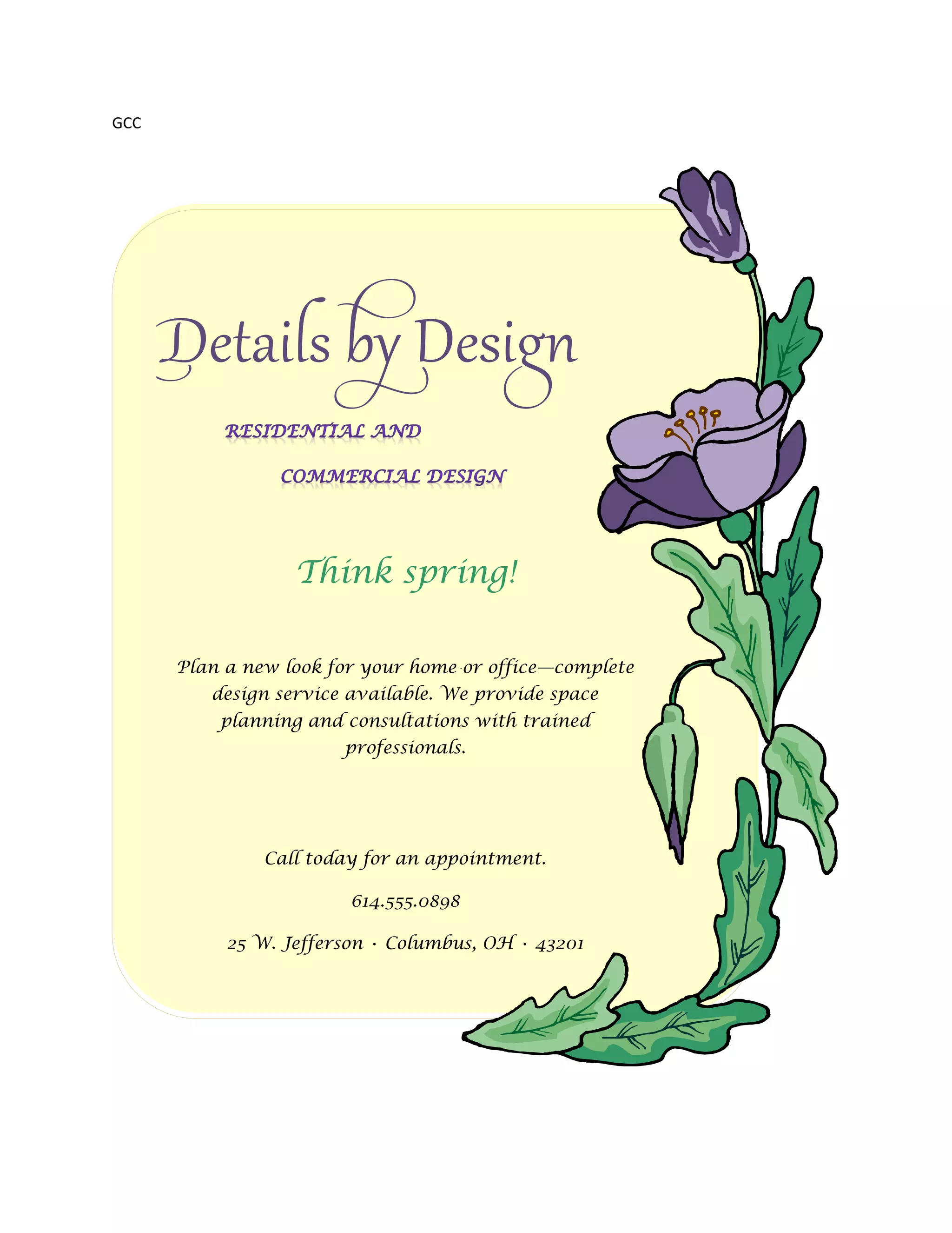 GCC provides complete design services including space planning and consultations with professionals to help plan a new look for homes or offices. They offer details by design thinking with a spring theme. Interested customers can call 614.555.0898 to schedule an appointment at their Columbus, Ohio location.