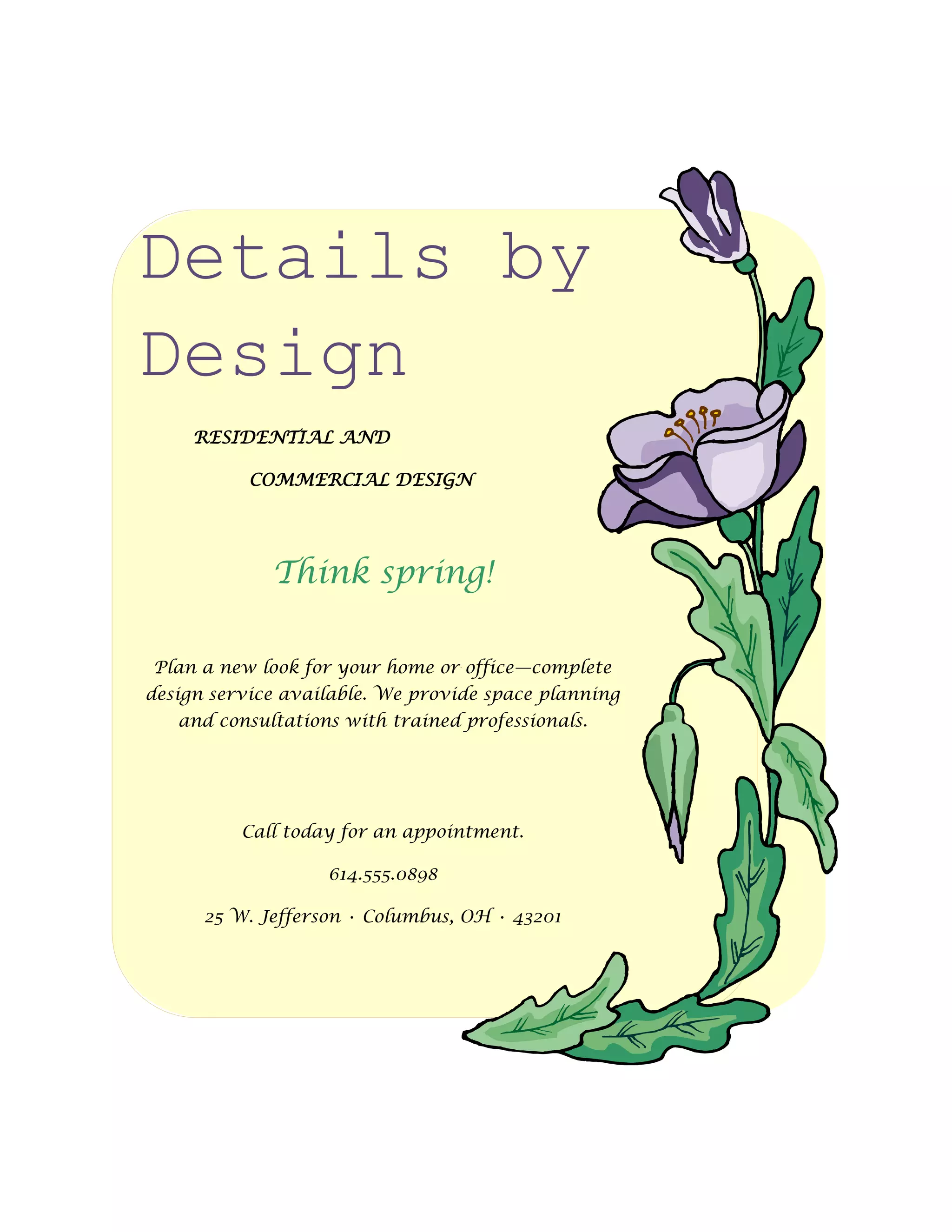 A design firm provides residential and commercial design services including space planning and consultations with professionals to help plan a new look for homes or offices for the spring. They can be contacted at 614.555.0898 located at 25 W. Jefferson in Columbus, Ohio to schedule an appointment.