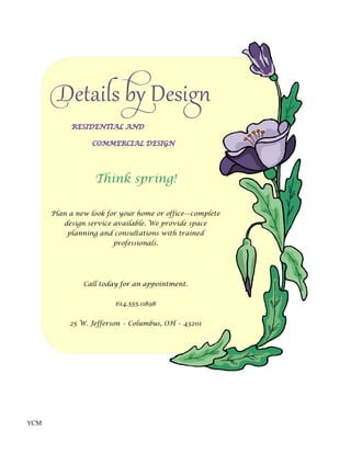 This document advertises design services for homes and offices, offering space planning and consultations with professionals to help plan a new look. The business provides a complete design service and can be contacted by calling their number to schedule an appointment. They are located in Columbus, Ohio.
