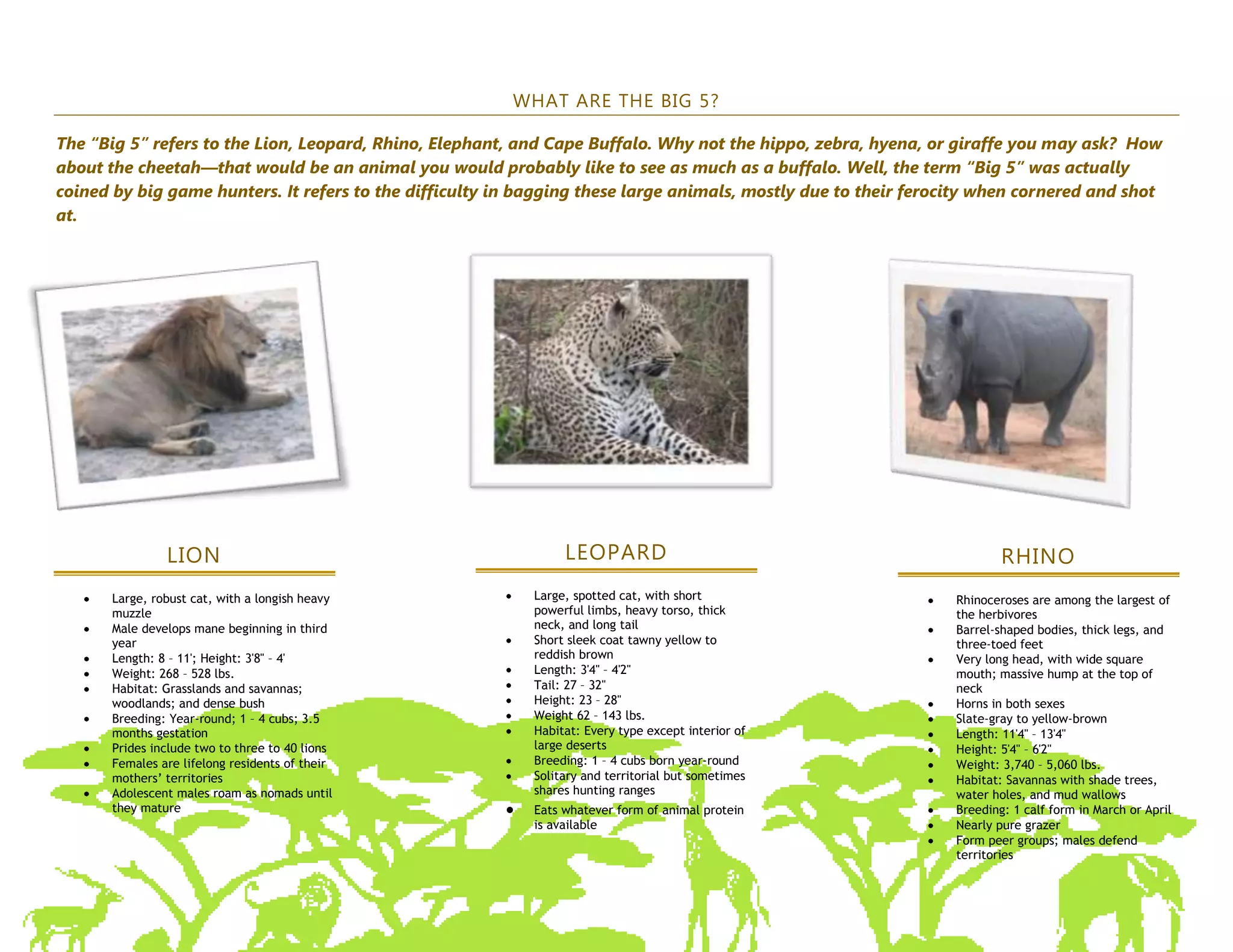 The Big 5 refers to 5 large and dangerous African animals: the lion, leopard, rhino, elephant, and Cape buffalo. These animals were designated the Big 5 by big game hunters due to the difficulty and danger involved in hunting them. Descriptions of each animal's physical traits and behaviors are then provided.