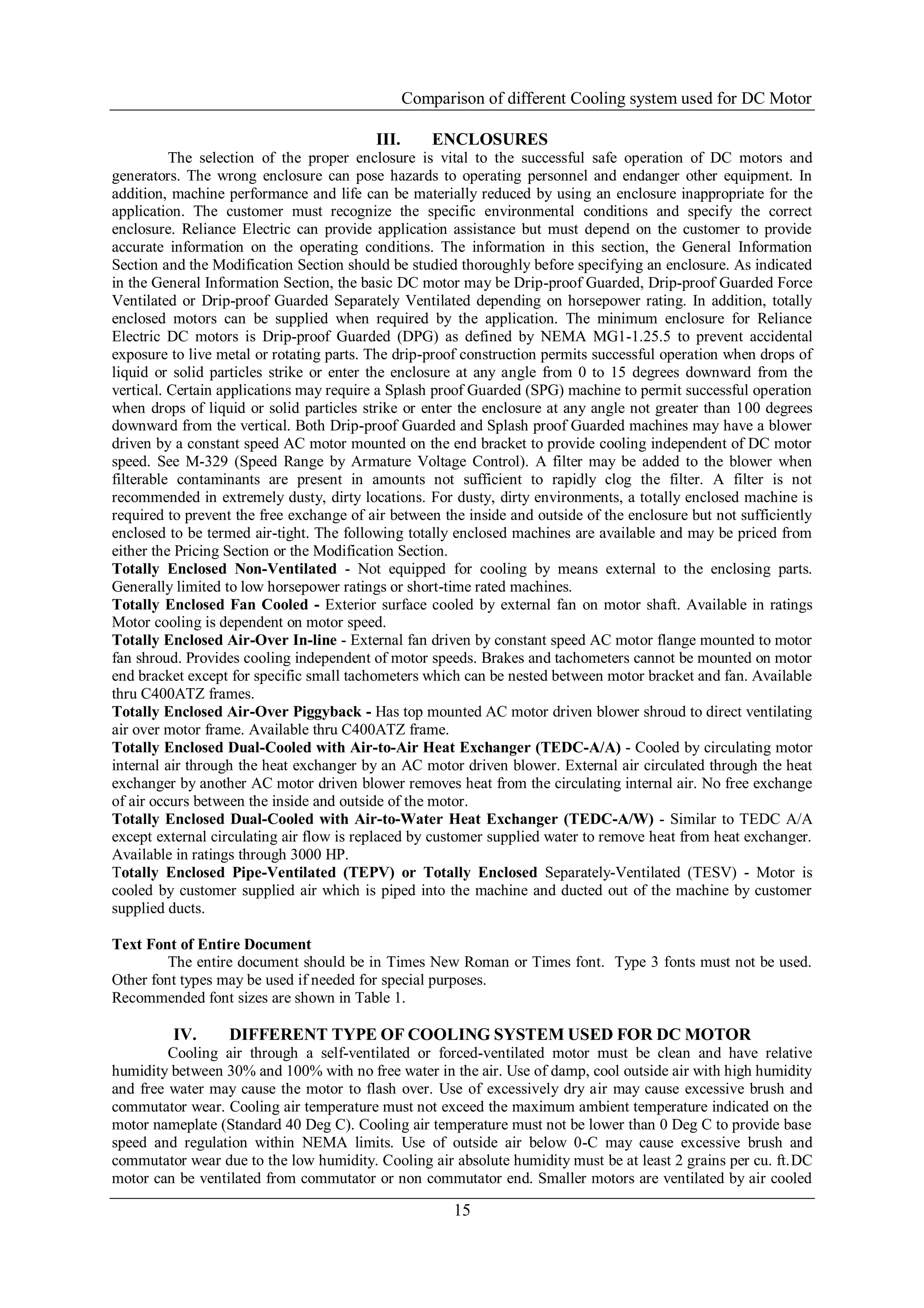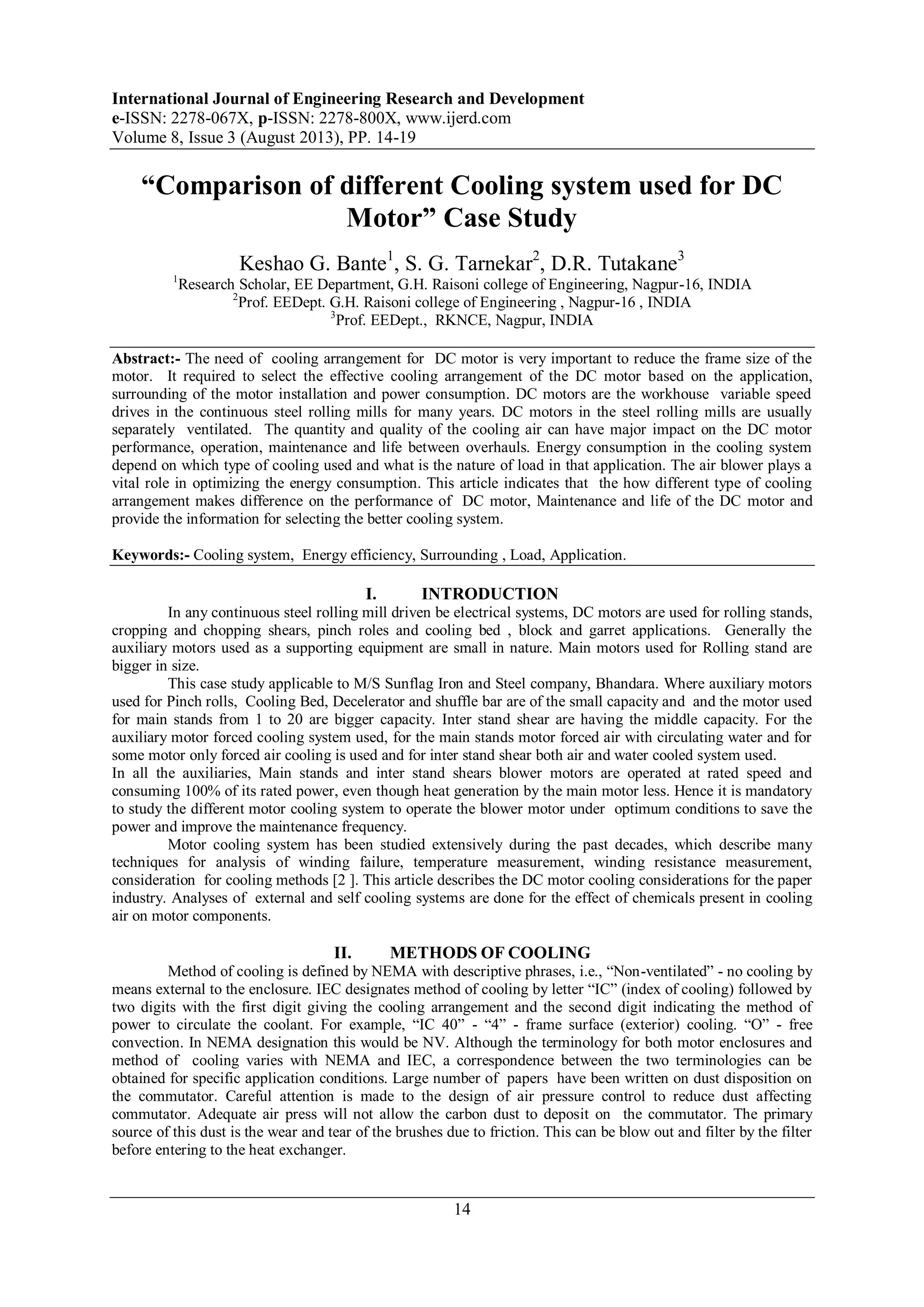 This document presents a comparative analysis of various cooling systems employed for DC motors, particularly in steel rolling mills, emphasizing the importance of effective cooling for performance and lifespan. It discusses different cooling techniques, their impact on power consumption, maintenance, and performance under various environmental conditions. The study concludes that circulating air and water cooling systems are optimal, especially in dusty and wet environments, despite higher initial costs due to greater reliability and reduced maintenance requirements.