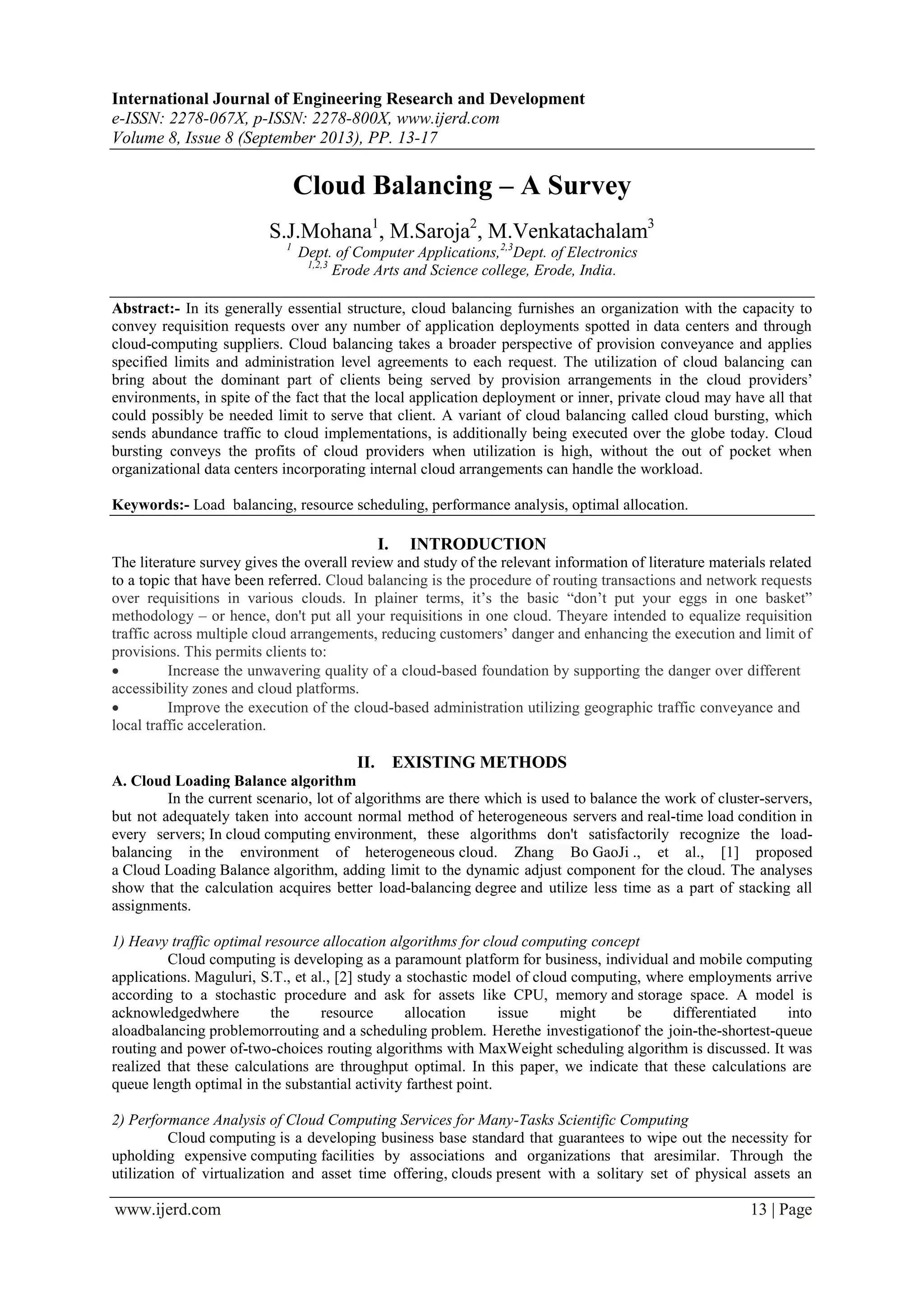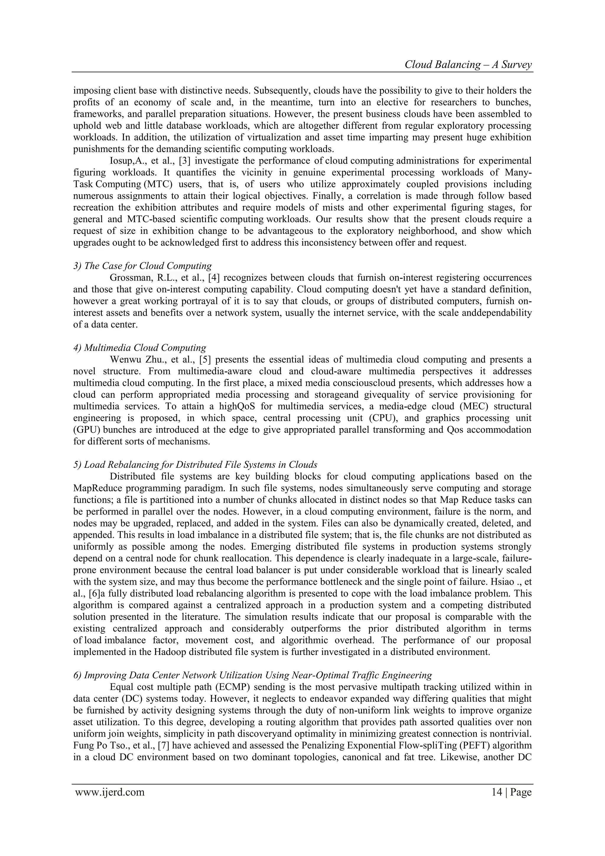 The document reviews cloud balancing, which enables efficient distribution of application requests across multiple cloud environments to improve performance and reliability. It discusses various existing algorithms and models aimed at optimizing resource allocation, balancing loads, and enhancing cloud service efficiency. The literature survey highlights the need for advanced methods to address challenges associated with heterogeneous server environments and dynamic workloads in cloud computing.