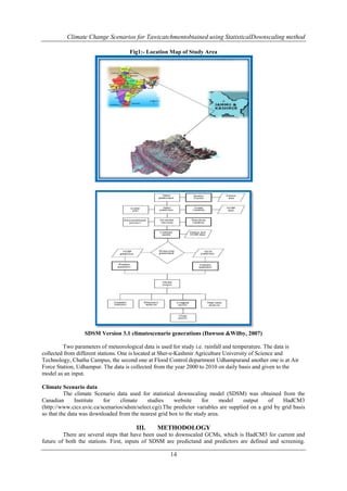The study applies the Statistical Downscaling Method (SDSM) to forecast climate change scenarios for the Tawi catchment in Jammu, focusing on rainfall and temperature data. Results indicate a reliable performance of the SDSM model in projecting daily temperature while showing more variability in precipitation estimates. Future projections suggest increasing trends in both maximum and minimum temperatures for all scenarios, while precipitation trends demonstrate a decreasing pattern at the start of the rainy season and an increase towards its end.