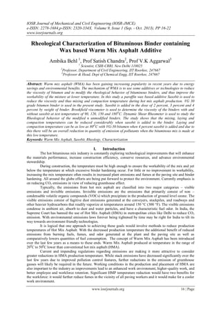 The document discusses the use of a paraffin wax-based additive, Sasobit, in warm mix asphalt (WMA) to reduce viscosity and improve the rheological properties of bituminous binders. The study finds that the inclusion of Sasobit can significantly lower the mixing and compaction temperatures, yielding environmental benefits such as reduced emissions. This innovation represents a cost-effective, sustainable approach for asphalt production, aligning with global efforts to lower CO2 emissions and improve construction efficiency.
