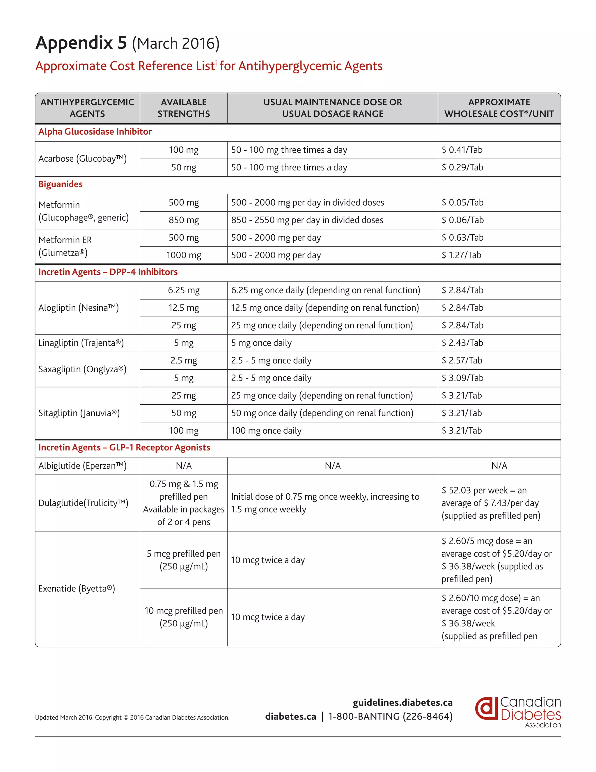 - Names of drugs, available strengths, usual maintenance doses, and approximate wholesale costs per unit. Drugs include various classes: biguanides, sulfonylureas, DPP-4 inhibitors, GLP-1 receptor agonists, SGLT2 inhibitors, basal insulins, and premixed insulins.