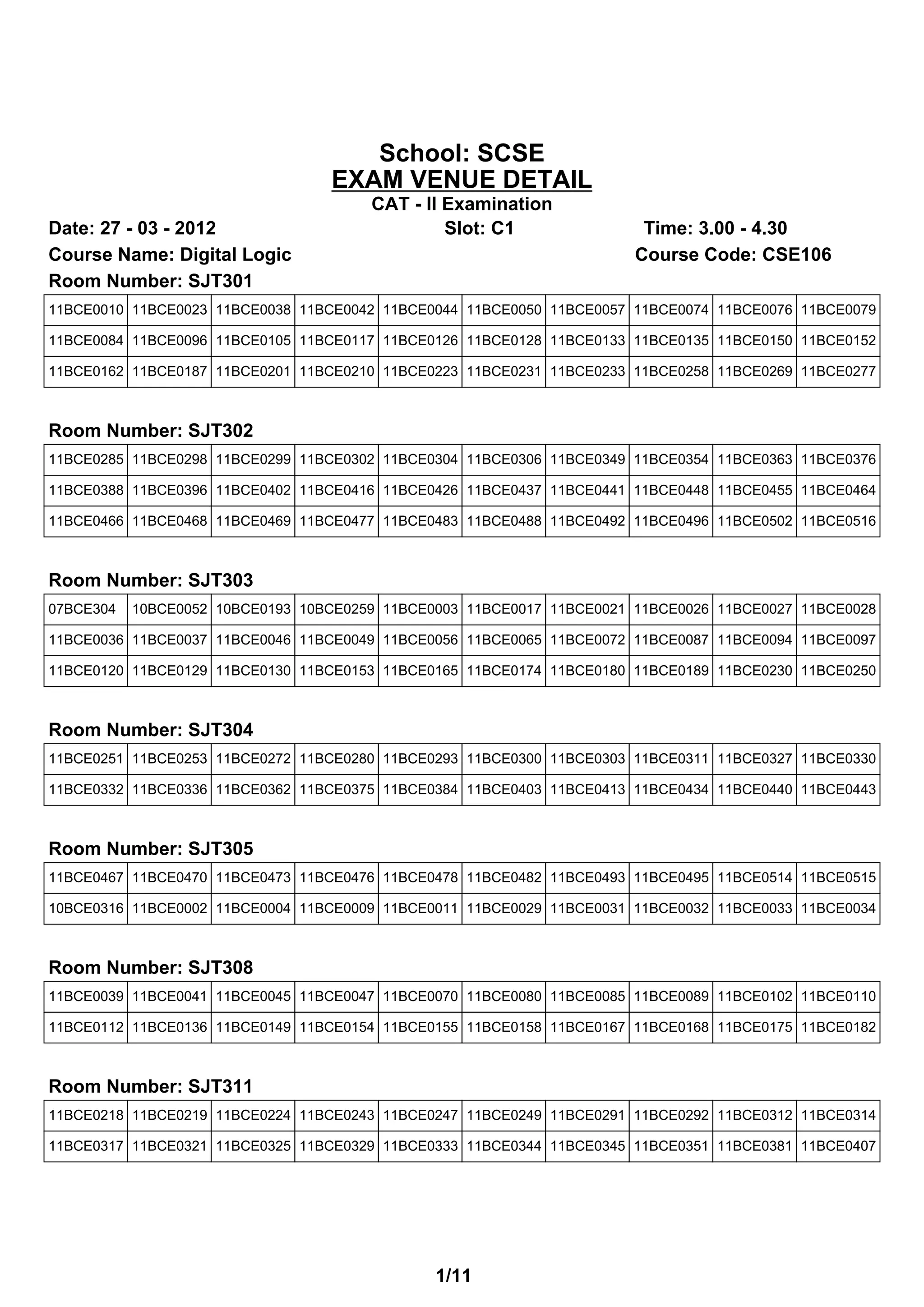 The document provides details of exam venues for various courses taking place on 27-03-2012 from 3:00-4:30 PM. It lists the room numbers and roll numbers of students taking exams for courses like Digital Logic, Linear Algebra, Psychology and Sociology, Object Oriented Programming, and Introduction to Computer Networks. The exams are happening in rooms SJT301 through SJT324, SJT401, SJT402, SJT308 and SJT311 at the School of Computer Science and Engineering (SCSE).