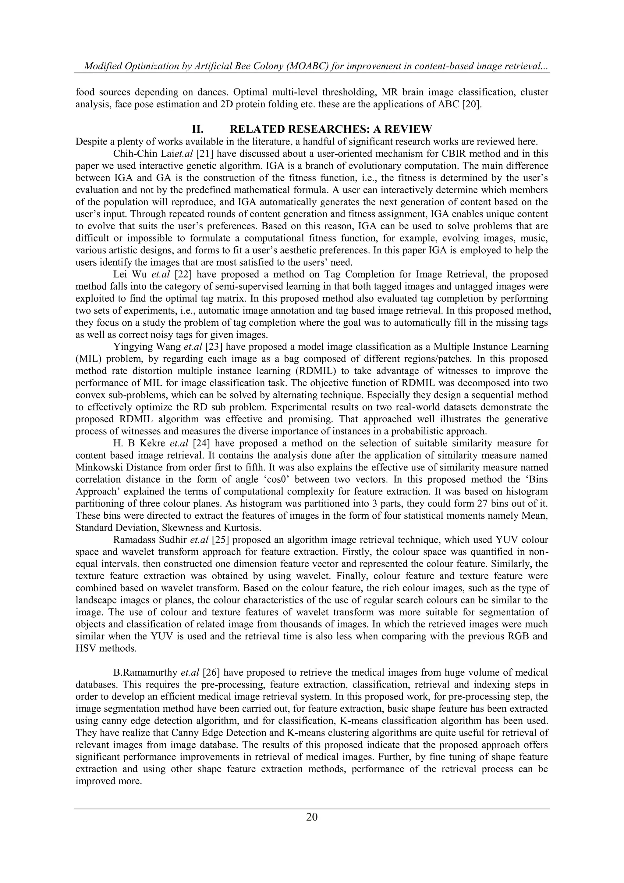 The document presents a modified artificial bee colony (moabc) optimization algorithm aimed at enhancing content-based image retrieval (CBIR) systems. It emphasizes the algorithm's effectiveness in minimizing feature vector dimensions while improving the retrieval performance compared to existing methods like particle swarm optimization and genetic algorithms. The paper outlines the role of color, texture, and shape in feature extraction and suggests an optimization framework applicable to various image databases.