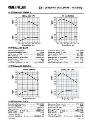 - Performance data across a range of 305-370 horsepower configurations, including operating speed range, governed speed, peak torque specifications.