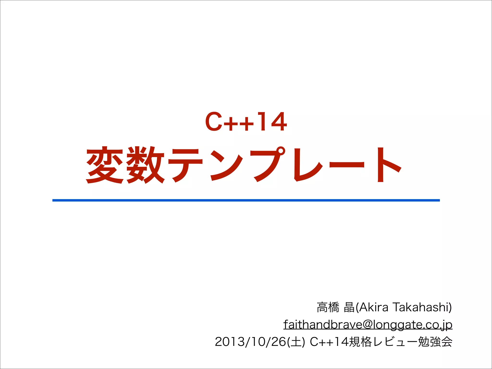C++14 変数テンプレート 高橋 晶(Akira Takahashi) faithandbrave@longgate.co.jp 2013/10/26(土)