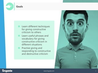 1. The document discusses techniques for giving constructive criticism, including being specific, focusing on behavior not the person, and providing recommendations for improvement.