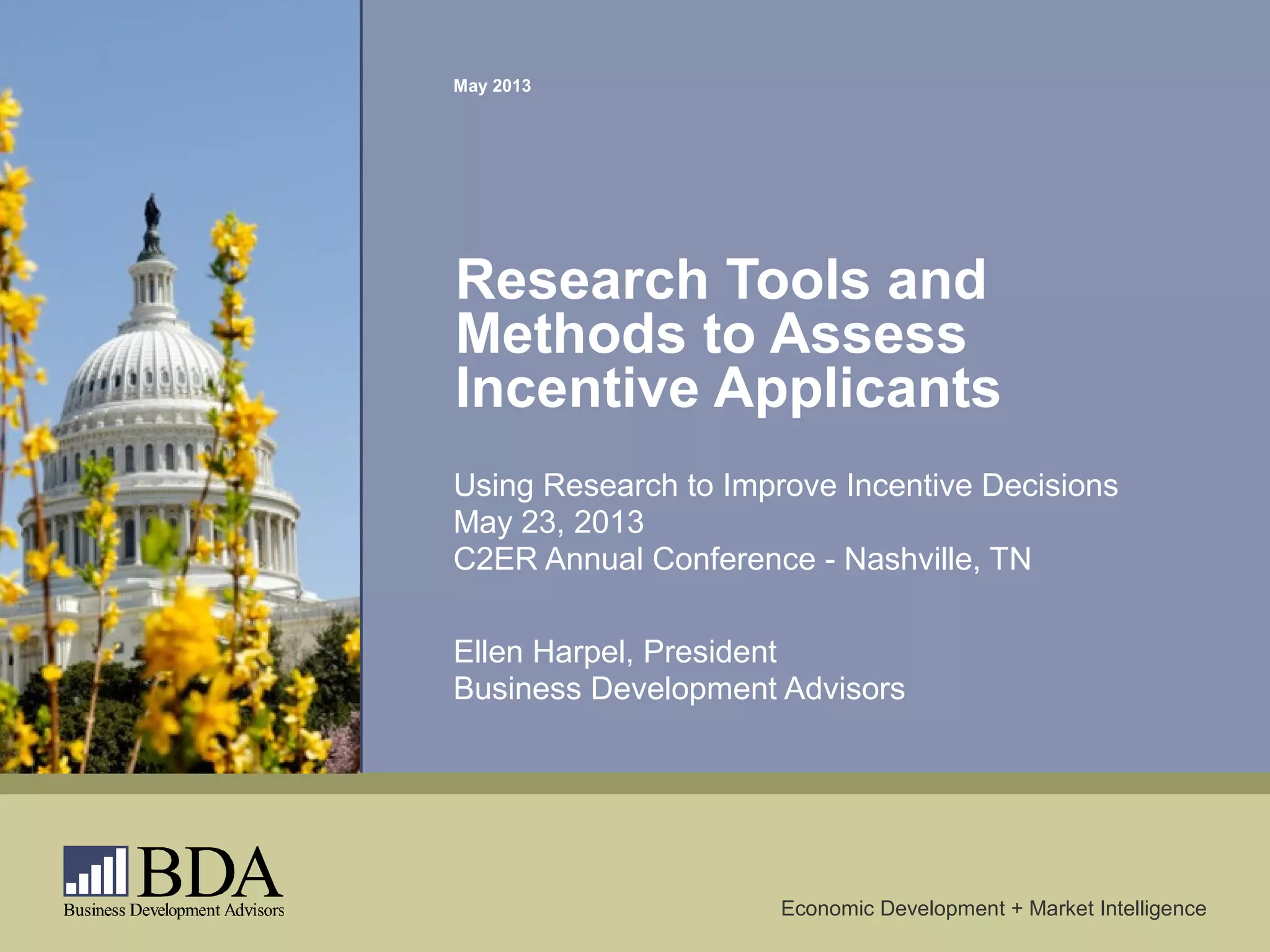 Ellen Harpel presented on using research tools and methods to assess incentive applicants. She discussed how conducting background research on companies can help economic developers 1) reduce risk by identifying problematic companies early, 2) level the playing field by obtaining comparable information to what companies know about the location, and 3) promote transparency. Some key data sources discussed included company websites, SEC filings, press reports, and business directories. The type of company - public, private, small, or international - impacts the level and types of information available.