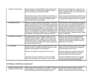 This internal controls checklist summarizes procedures that a bank should follow to properly manage accounts, transactions, and protect against fraud. Key points include: