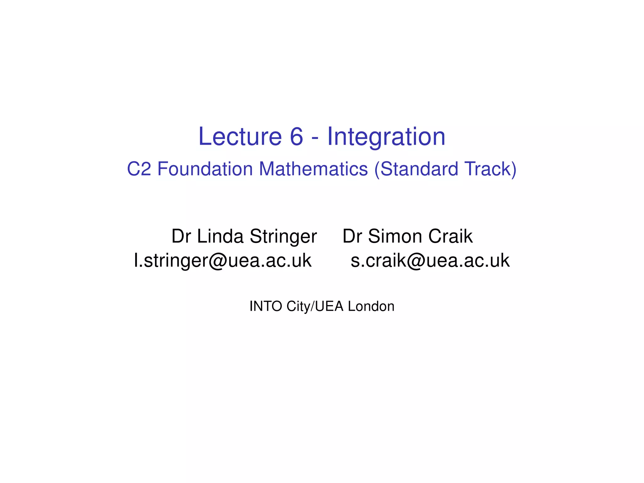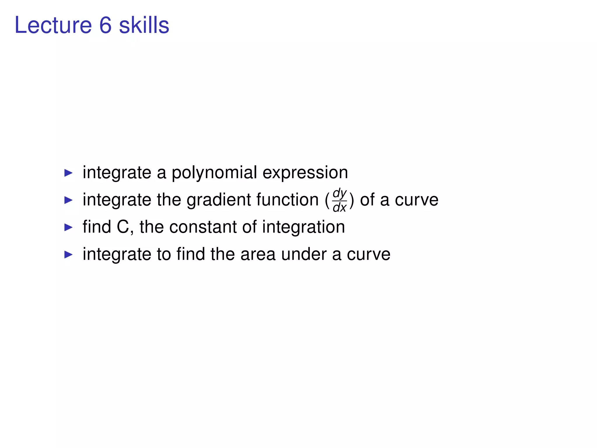 The document discusses integration, which is the reverse process of differentiation. It provides formulas for integrating polynomial expressions like xn and axn and explains how to find the constant of integration C. Examples are given for integrating expressions and finding the area under a curve by integrating between limits of integration.