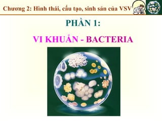 Chương 2 trình bày về hình thái, cấu tạo và sinh sản của vi khuẩn, phân chia thành hai loại chính là eubacteria và archaea, với sự khác biệt về cấu trúc tế bào và môi trường sống. Nội dung cũng đề cập đến các đặc điểm hình thái của vi khuẩn như cầu khuẩn, trực khuẩn và xoắn khuẩn, cùng với cấu trúc tế bào bao gồm thành tế bào, màng nguyên sinh chất và ribosome. Cuối cùng, chương cung cấp thông tin về quá trình sinh sản của vi khuẩn và khả năng tạo bào tử khi gặp điều kiện khắc nghiệt.