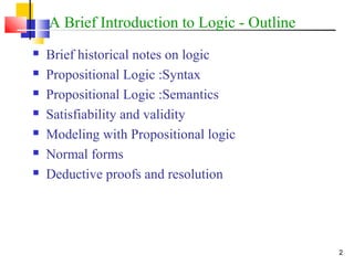 This document provides an outline and introduction to propositional logic. It discusses the history and development of logic from philosophical logic to its use in computer science. It covers propositional logic syntax using symbols and truth tables, semantics using the satisfaction relation, and the classification of formulas as valid, satisfiable, or unsatisfiable. It also introduces the decision problem of determining if a formula is satisfiable.
