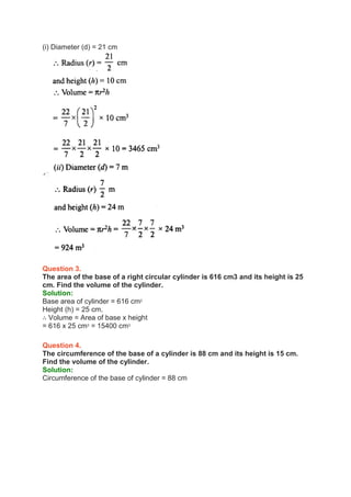This document contains 35 multi-part math word problems involving the volume, surface area, radius, height, diameter, and other properties of cylinders. The problems provide these cylinder dimensions and ask the reader to calculate various volume, area, ratio, and other metrics. Sample solutions are provided that show the calculations for determining these values based on the cylinder geometry formulas of volume, surface area, etc.