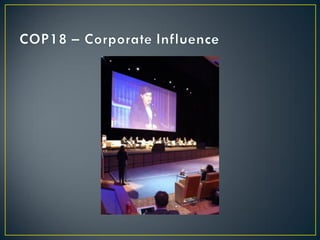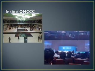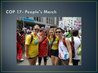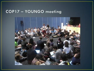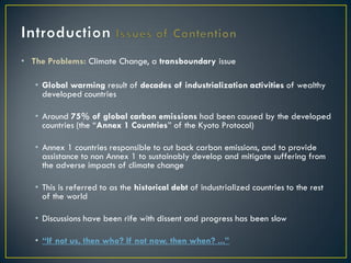 The United Nations Framework Convention on Climate Change (UNFCCC) was created in 1992 to cooperatively consider what can be done to reduce global warming and cope with whatever temperature increases are inevitable. It has held annual Conferences of the Parties since 1995 where member countries discuss emissions targets and negotiate agreements. The Kyoto Protocol was adopted in 1997 to establish legally binding emissions reduction targets for developed countries. Subsequent COPs have extended and refined the Kyoto Protocol while working to involve more countries in a successor agreement to address climate change through 2020 and beyond.