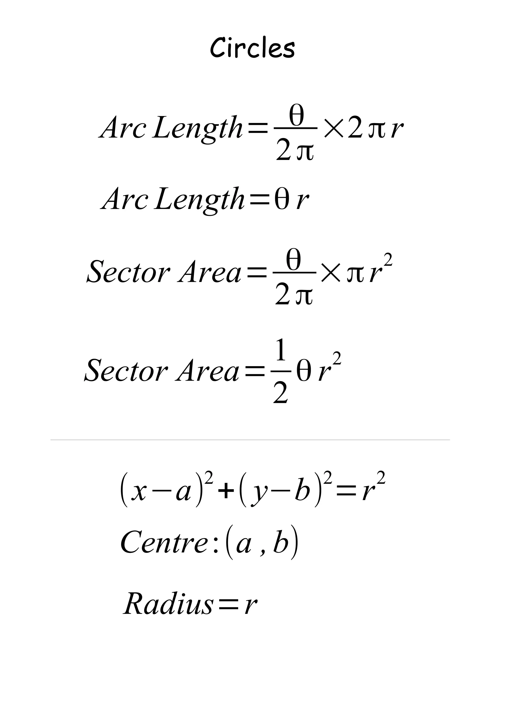 - Triangles (sine rule, cosine rule, area formula, Pythagoras' theorem)