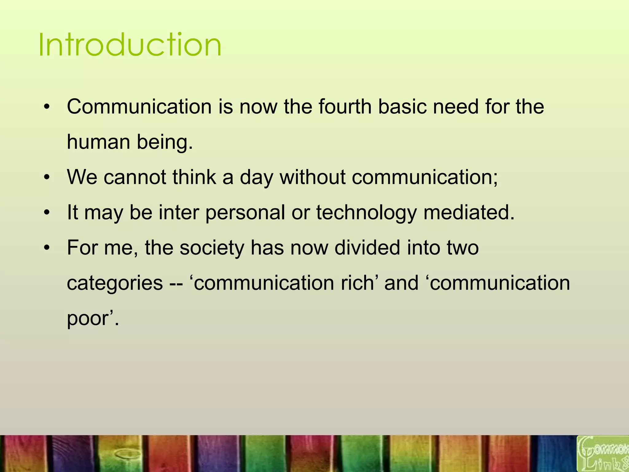 The document proposes a model called Community Communications Centre (C3) to help address the digital divide. C3 would be a community center providing communication facilities and services. It would offer (1) Community Information and Learning services through a library, newspapers, radio, TV, internet and screening hall, (2) Community Participatory services like a community newspaper and radio, and (3) Community Archiving services to preserve community history and media. C3 aims to make communication accessible to all in the community and empower them through information sharing and participatory media and services. It would be managed by a community steering committee and funded through community or external sources.